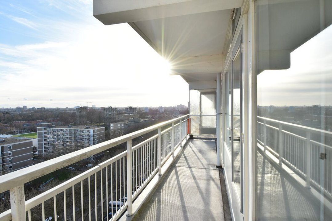 Very well maintained communal entrance with video intercom and the caretaker's office. Elevator to the tenth floor, via gallery (with beautiful views) to the front door. Apartment entrance, hall with meter cupboard, L-shaped hallway with very deep closet and access to all rooms. Spacious and bright living / dining room with access to the very sunny south-east facing balcony with a beautiful view.