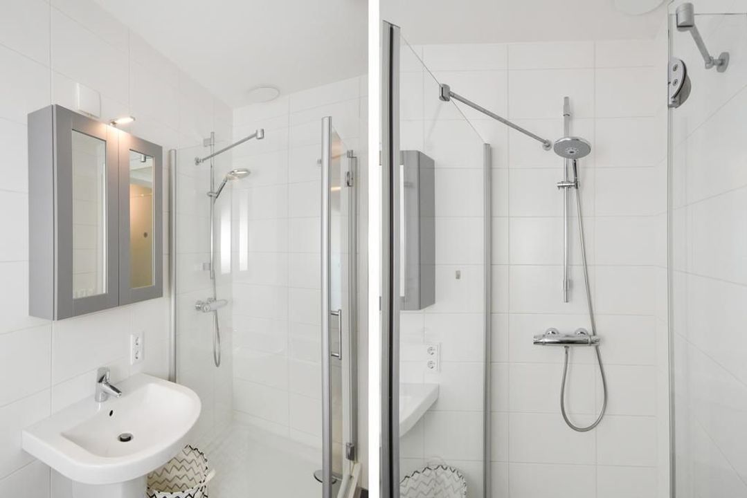 Spacious hallway with video intercom and a modern guest toilet. The bright and generous living and dining area opens through sliding glass doors onto a full-width balcony, perfect for enjoying the views. The open-plan kitchen is fully equipped with an induction hob, dishwasher, and combination microwave/oven.