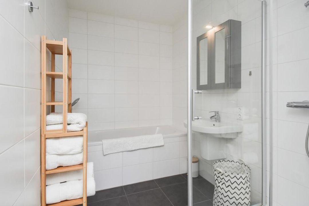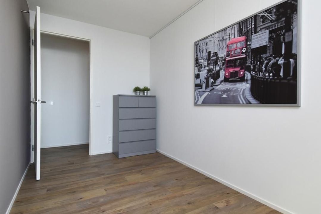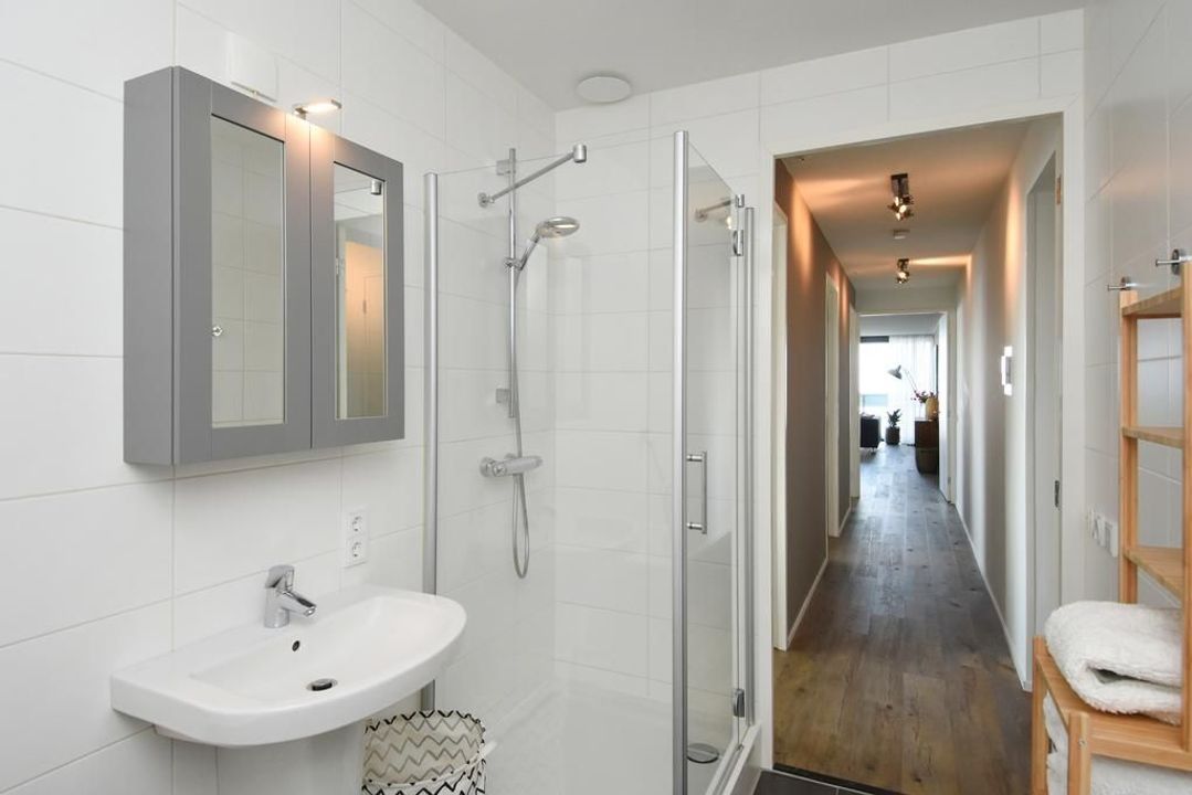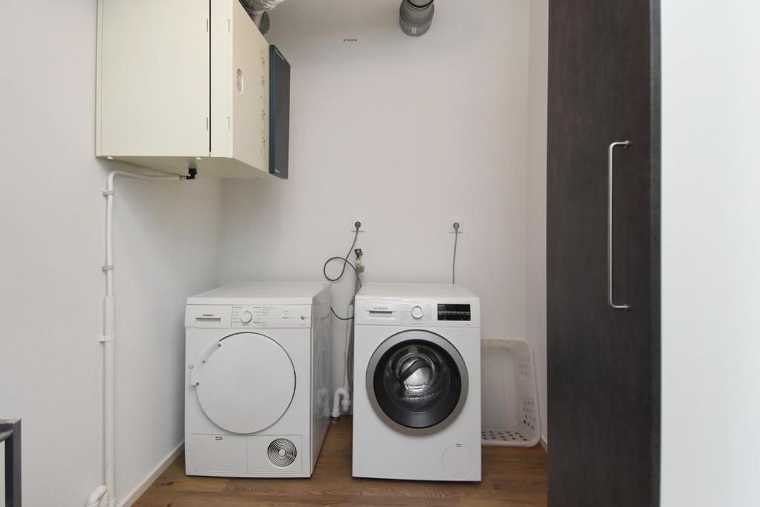 The apartment features a large master bedroom, a second bedroom, and a third bedroom ideal as a study or guest room. The stylish bathroom includes a bathtub, separate walk-in shower, and washbasin. A practical utility/storage room is equipped with a washing machine and dryer.