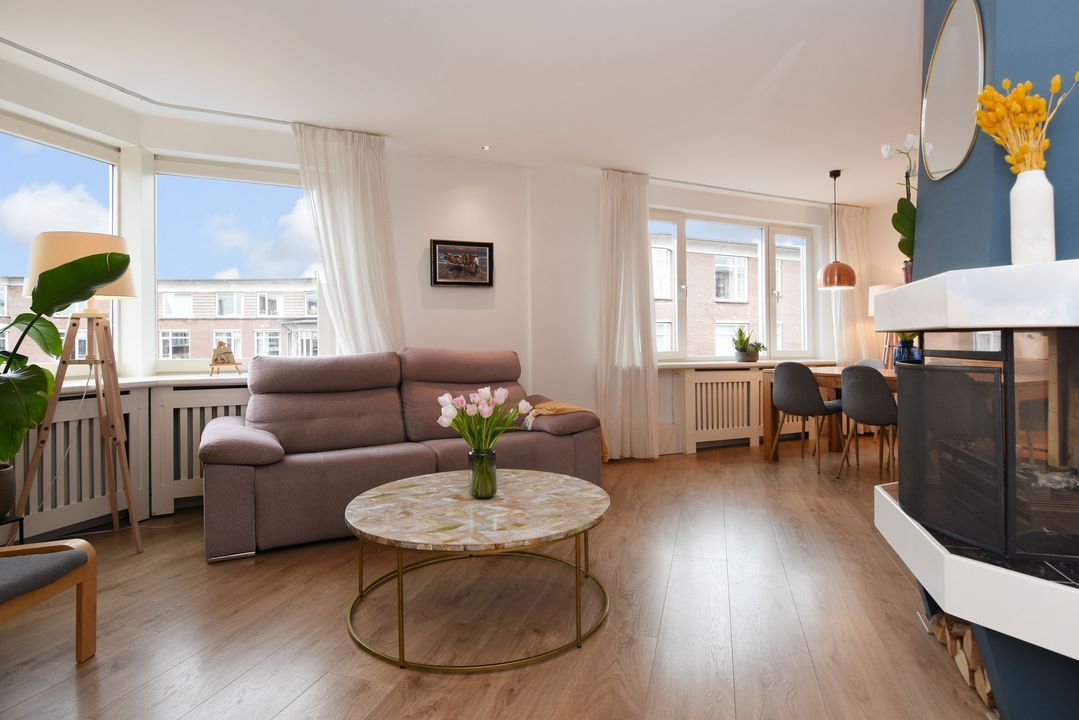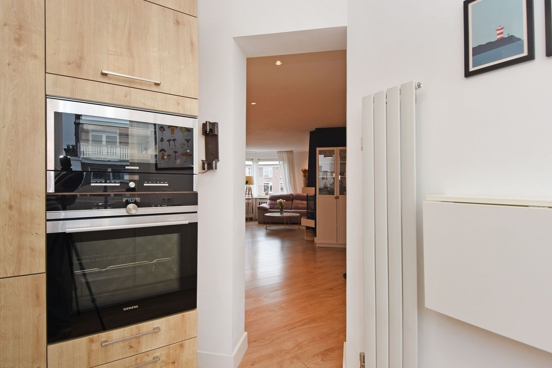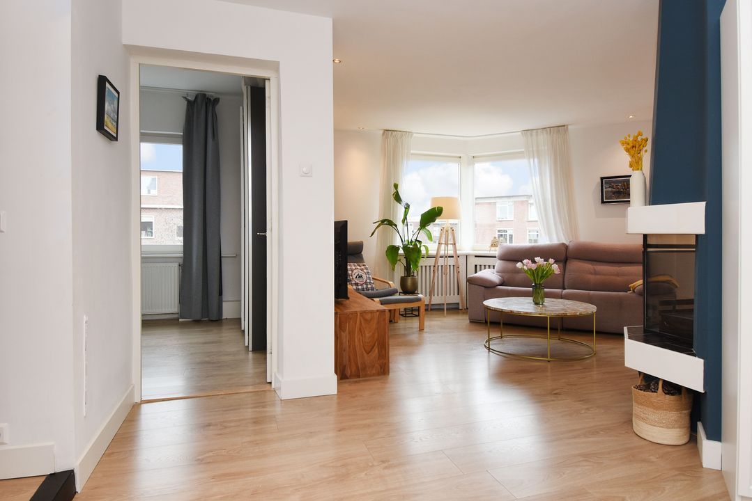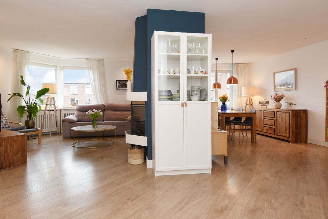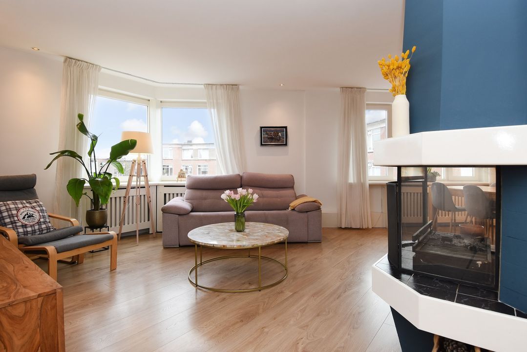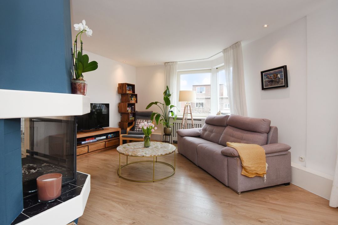 via open "Haags" portiek naar de eerste verdieping, entree appartement, hal met garderobe, meterkast, trap naar 3e woonlaag, u bevindt zich direct in de zeer royale, lichte woon-eetkamer met de in het midden gelegen open-haard, door de ligging van het appartement in de knik/hoek ontstaat een speelse ruimte. Moderne keuken met o.a. een 5-pits gaskookplaat, oven, stoomoven, vaatwasser, koel/vriescombinatie. Verder is er een bijkeuken met veel bergruimte, wasmachine- en drogeraansluiting en toegang naar klein balkon. Modern vrijhangend toilet. Slaapkamer aan de voorzijde met eigen moderne badkamer met douche en vaste wastafel.