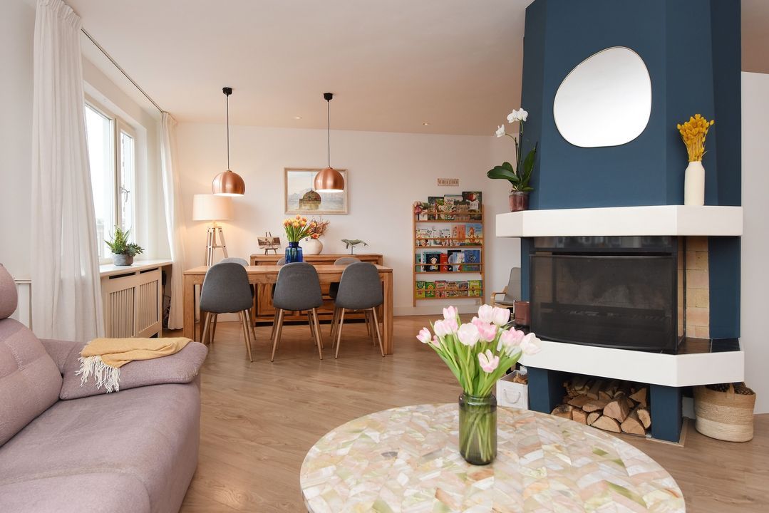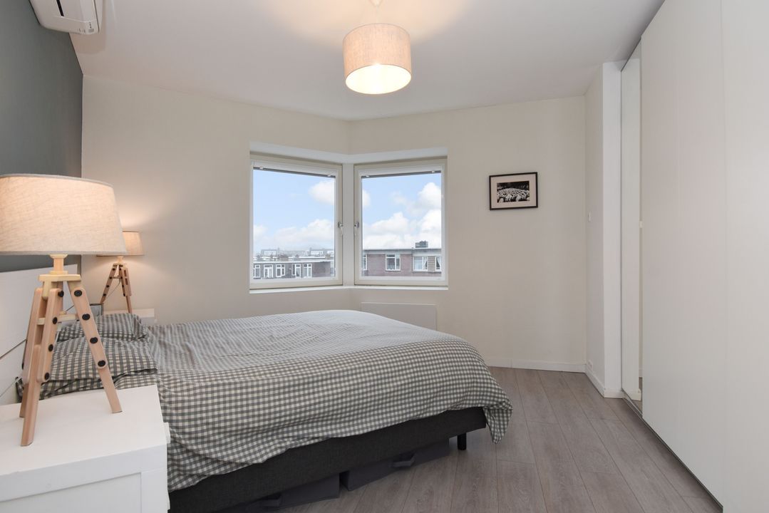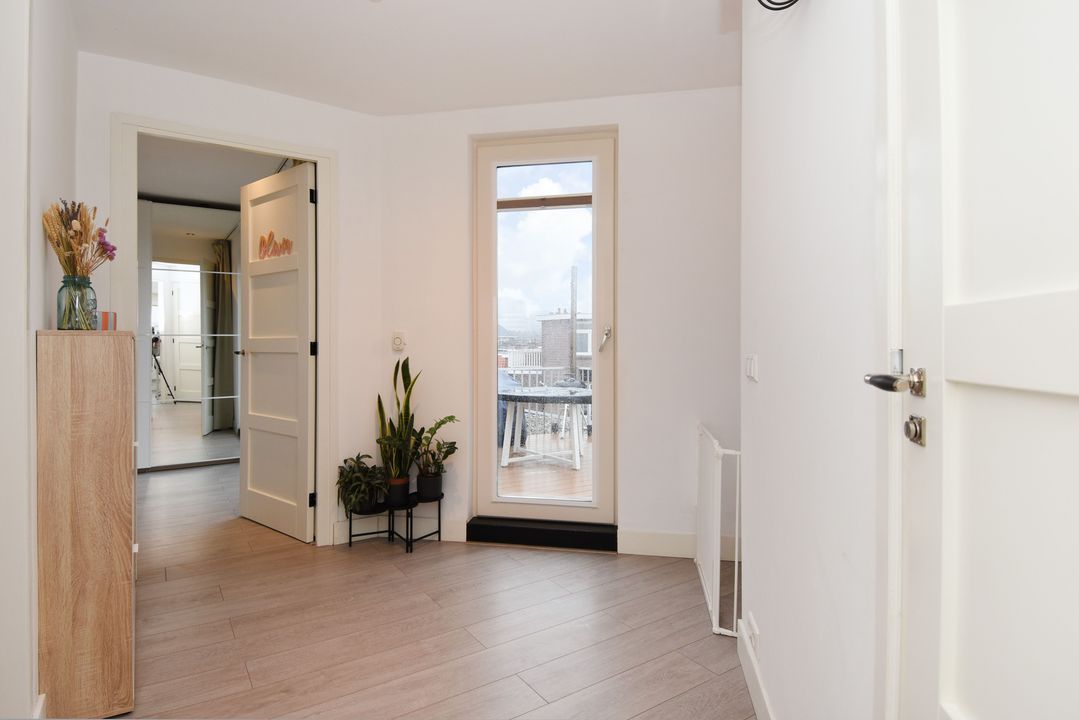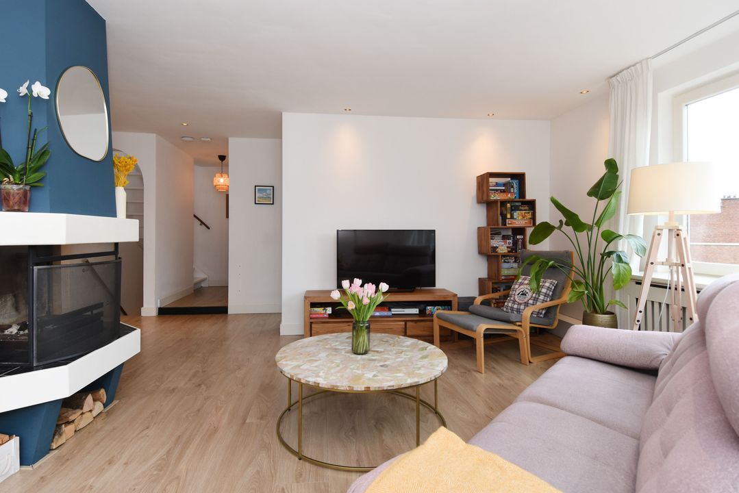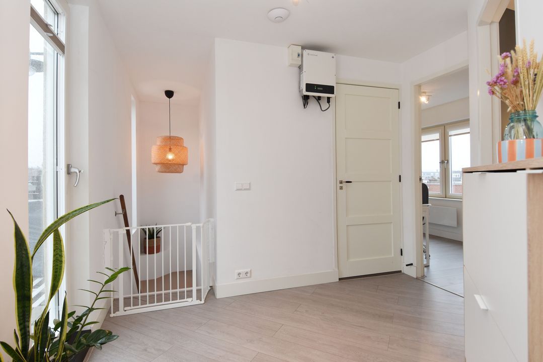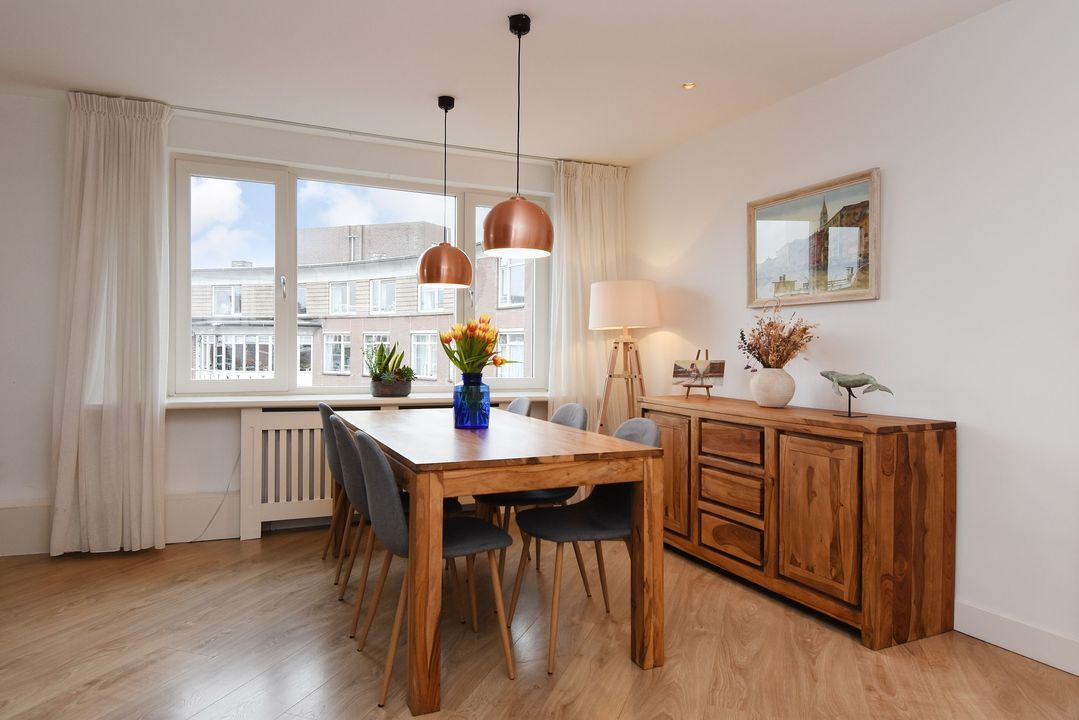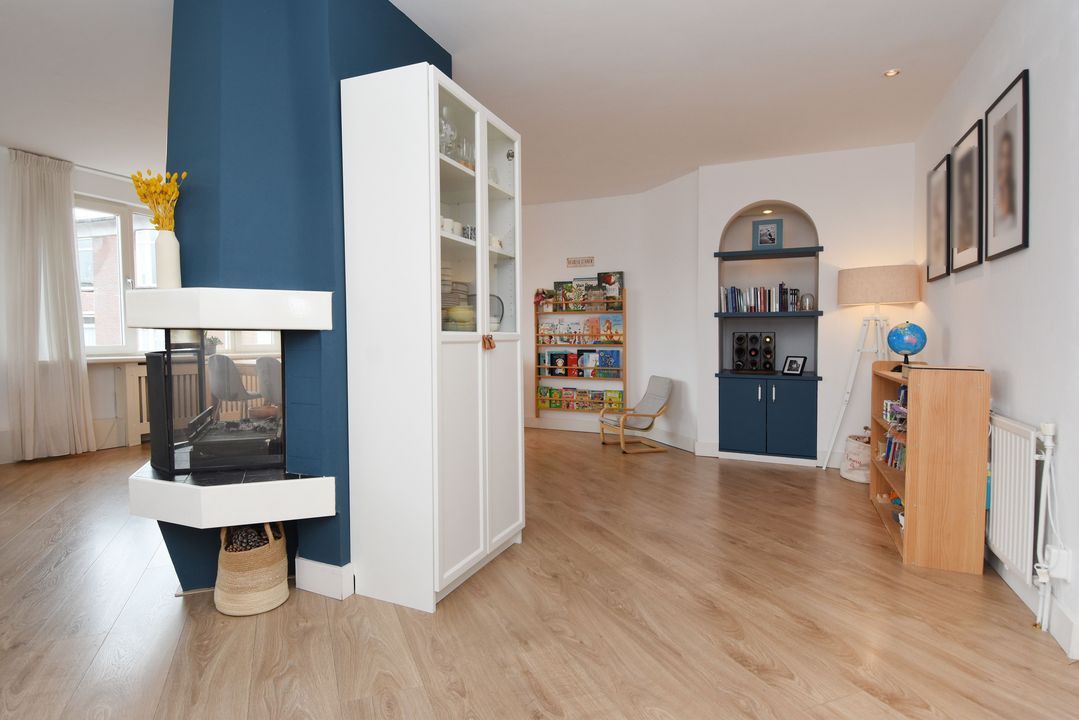 via open "Haags" portiek naar de eerste verdieping, entree appartement, hal met garderobe, meterkast, trap naar 3e woonlaag, u bevindt zich direct in de zeer royale, lichte woon-eetkamer met de in het midden gelegen open-haard, door de ligging van het appartement in de knik/hoek ontstaat een speelse ruimte. Moderne keuken met o.a. een 5-pits gaskookplaat, oven, stoomoven, vaatwasser, koel/vriescombinatie. Verder is er een bijkeuken met veel bergruimte, wasmachine- en drogeraansluiting en toegang naar klein balkon. Modern vrijhangend toilet. Slaapkamer aan de voorzijde met eigen moderne badkamer met douche en vaste wastafel.