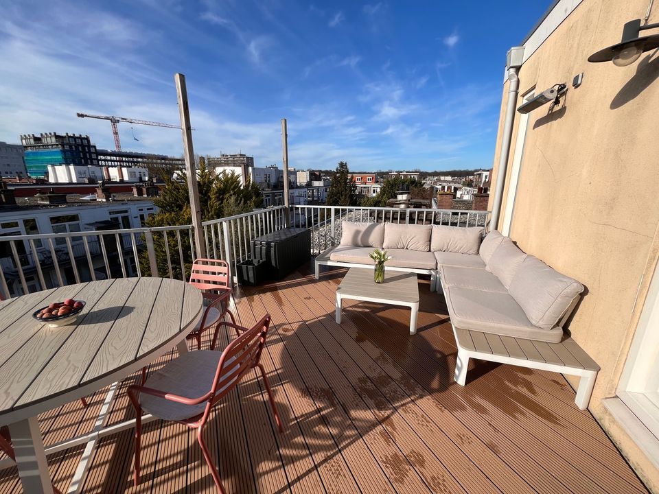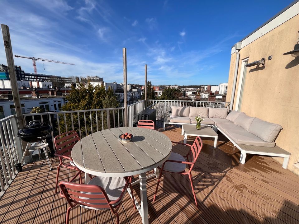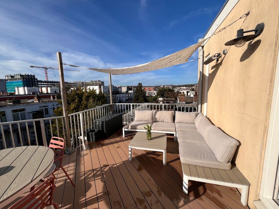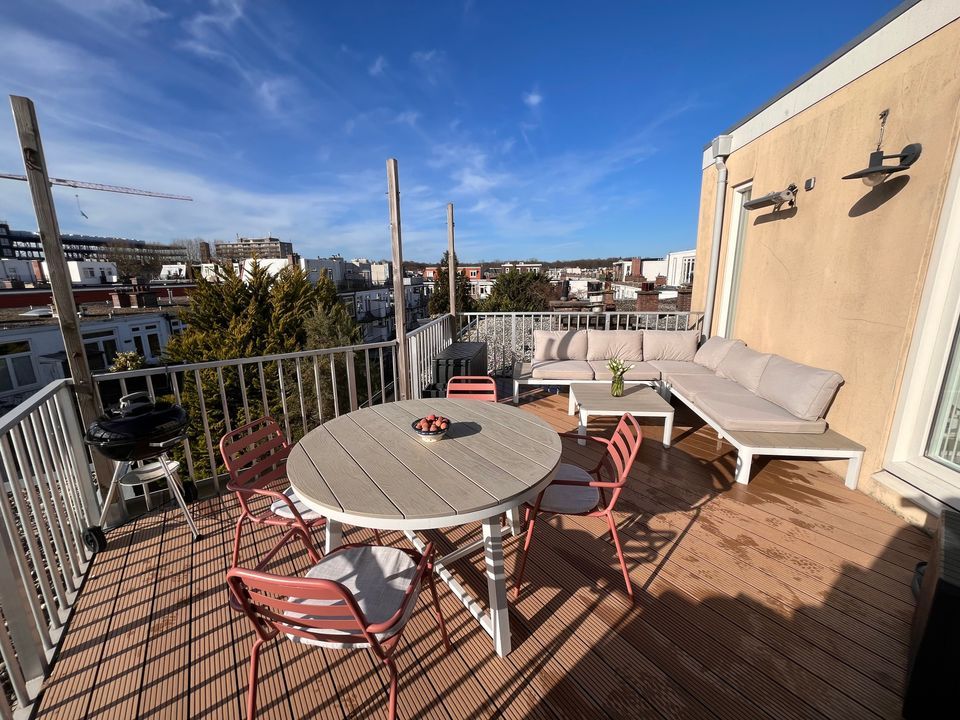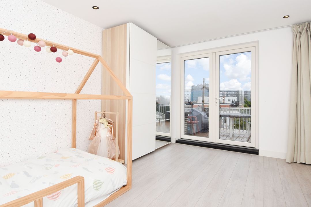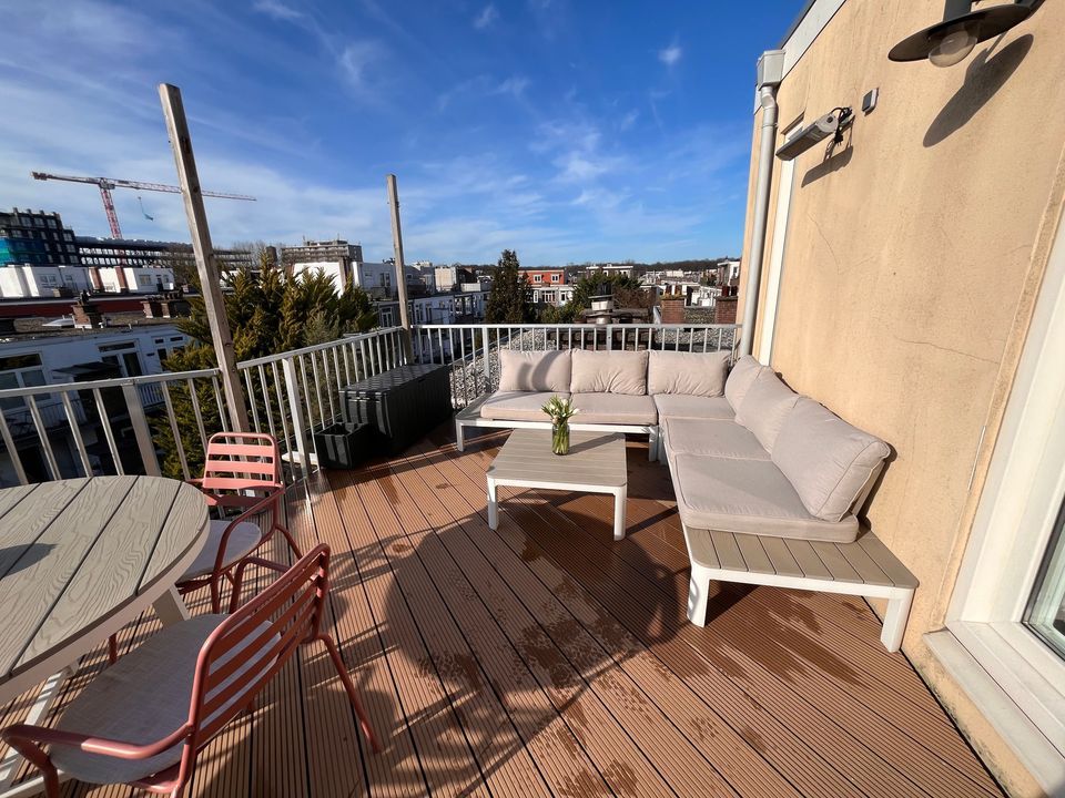 ruime overloop, grote slaapkamer met toegang tot het dakterras, slaapkamer met airco, slaap/studeerkamer met airco. Moderne badkamer met inloop douche, dubbele wastafel, toilet en designradiator. Vanuit de overloop toegang naar het zonnige ruime dakterras met fraai vrij uitzicht.