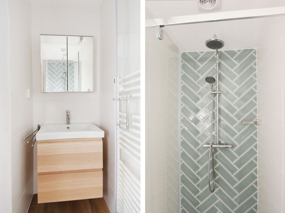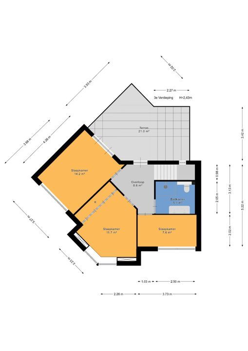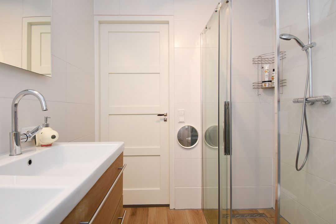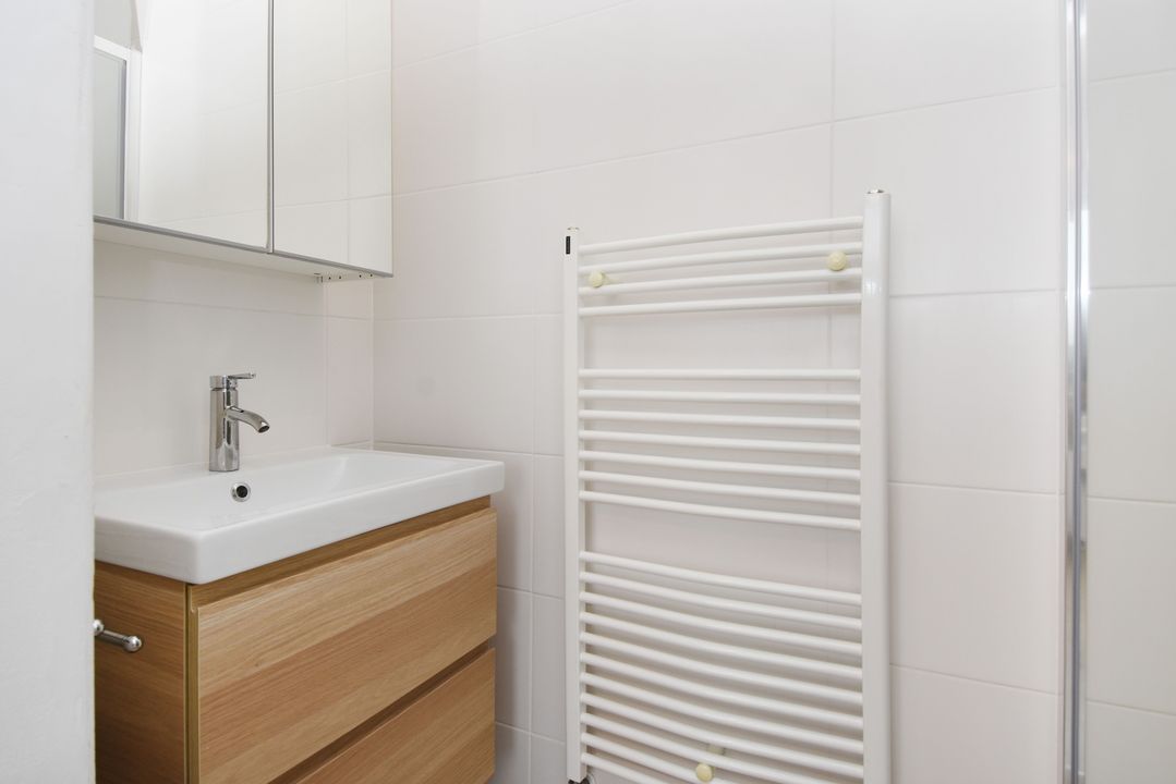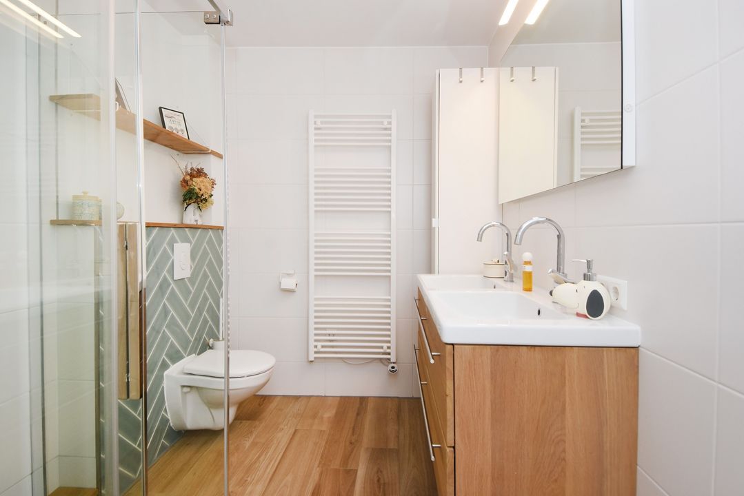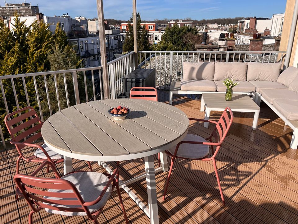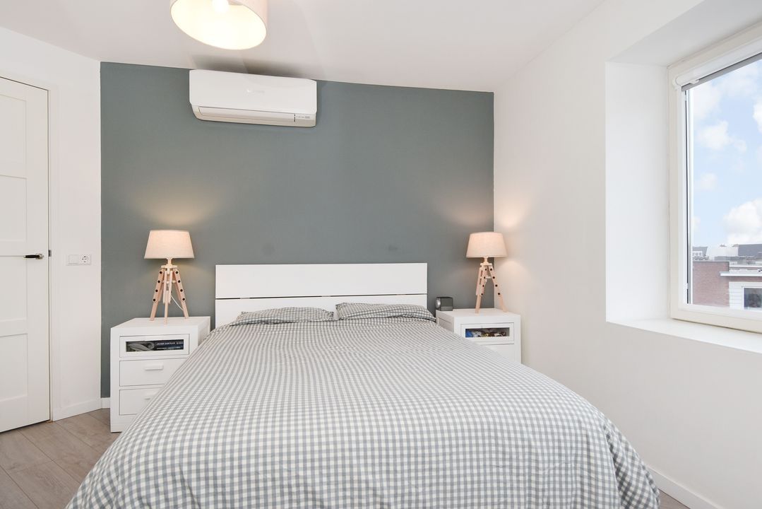 ruime overloop, grote slaapkamer met toegang tot het dakterras, slaapkamer met airco, slaap/studeerkamer met airco. Moderne badkamer met inloop douche, dubbele wastafel, toilet en designradiator. Vanuit de overloop toegang naar het zonnige ruime dakterras met fraai vrij uitzicht.