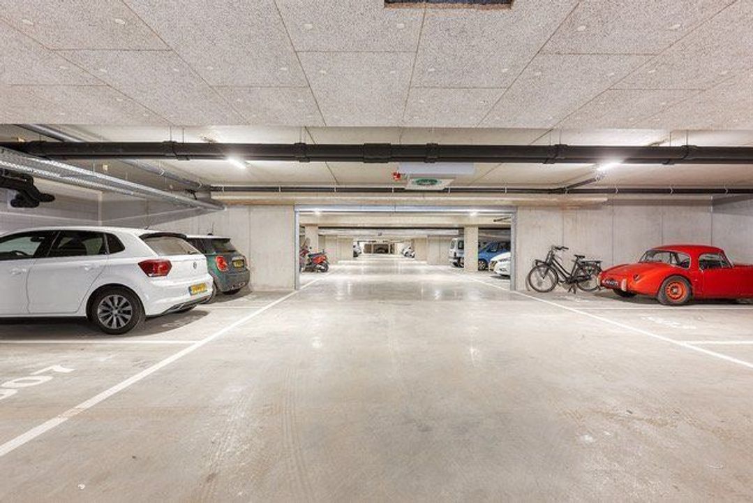 In the basement, you will find a private storage unit, a secure bicycle parking area, and a private parking space.