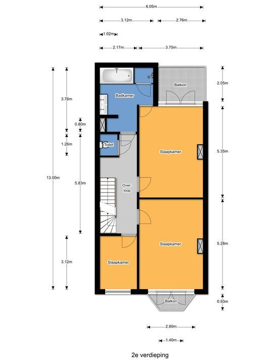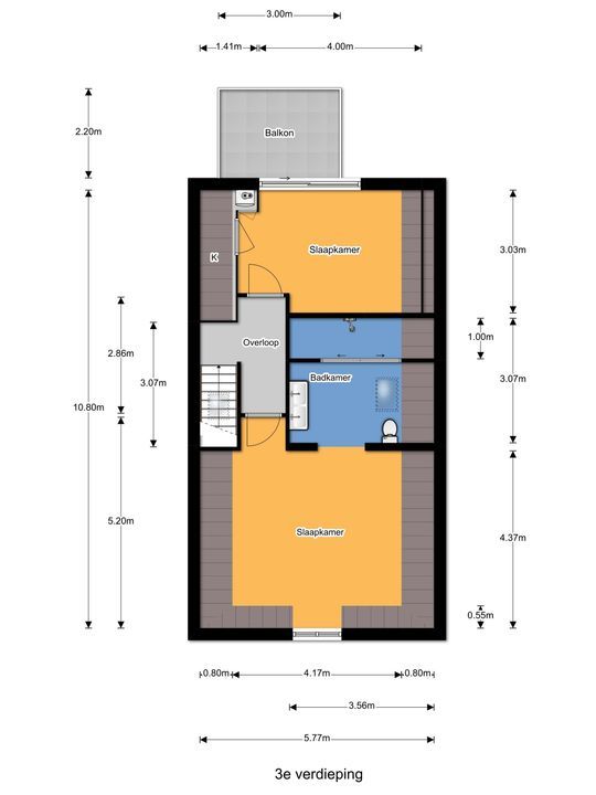 The top floor offers two more spacious bedrooms and an additional bathroom, ideal for larger families or for those who want extra privacy. The rear bedroom connects directly to a private balcony overlooking the surroundings, perfect for sitting outside and enjoying some fresh air. This level also includes storage areas and a central landing connecting all rooms.