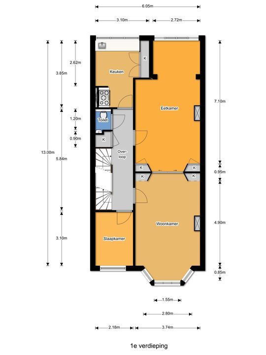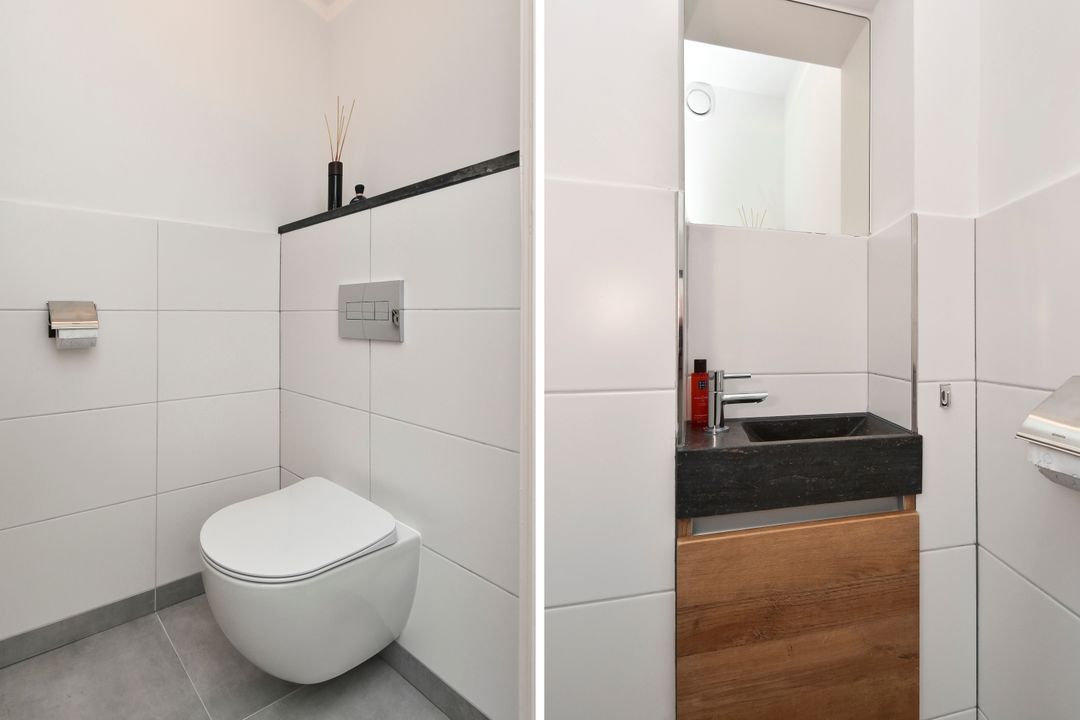 The first floor features a charming living room with large windows that allow plenty of natural light. A connected dining room offers ample space for family meals or entertaining guests. The separate kitchen is practical and well-designed, equipped with essential appliances and plenty of storage. On this level you will also find a convenient separate toilet and an additional bedroom that can serve as a guest room, home office, or hobby space.