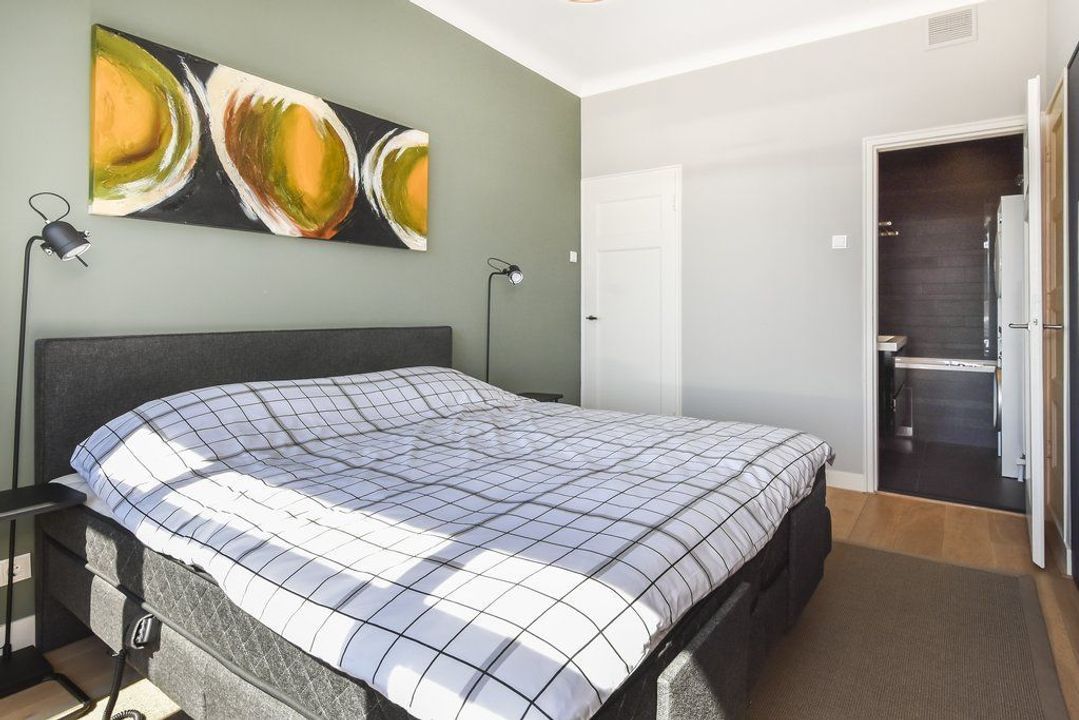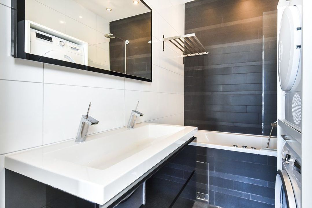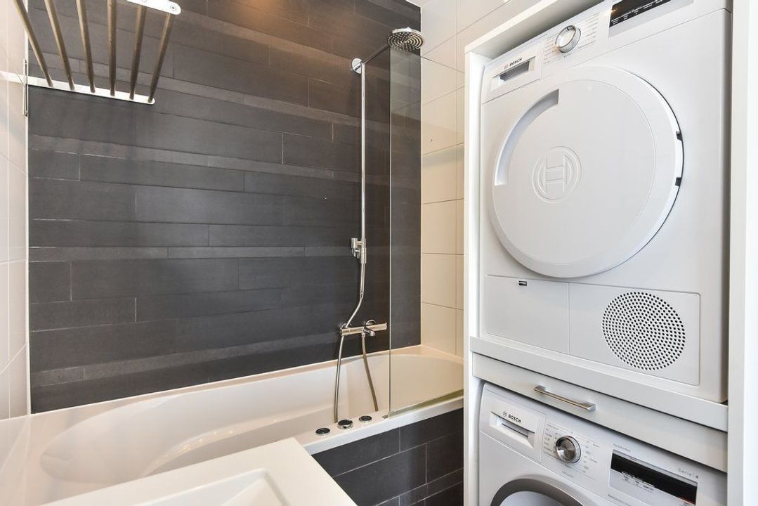 Entrance apartment, hall, very large and bright living/dining room. good sized balcony at the back. The modern kitchen is situated at the back of the apartment, equipped with appliances (fridge, dishwasher, combi-oven, gas hob and extractor). Spacious master bedroom at the back with fitted cupboard and en suite bathroom with bath and washbasin. 2nd bedroom. Good sized balcony at the back. Modern toilet. Storage on the ground floor.