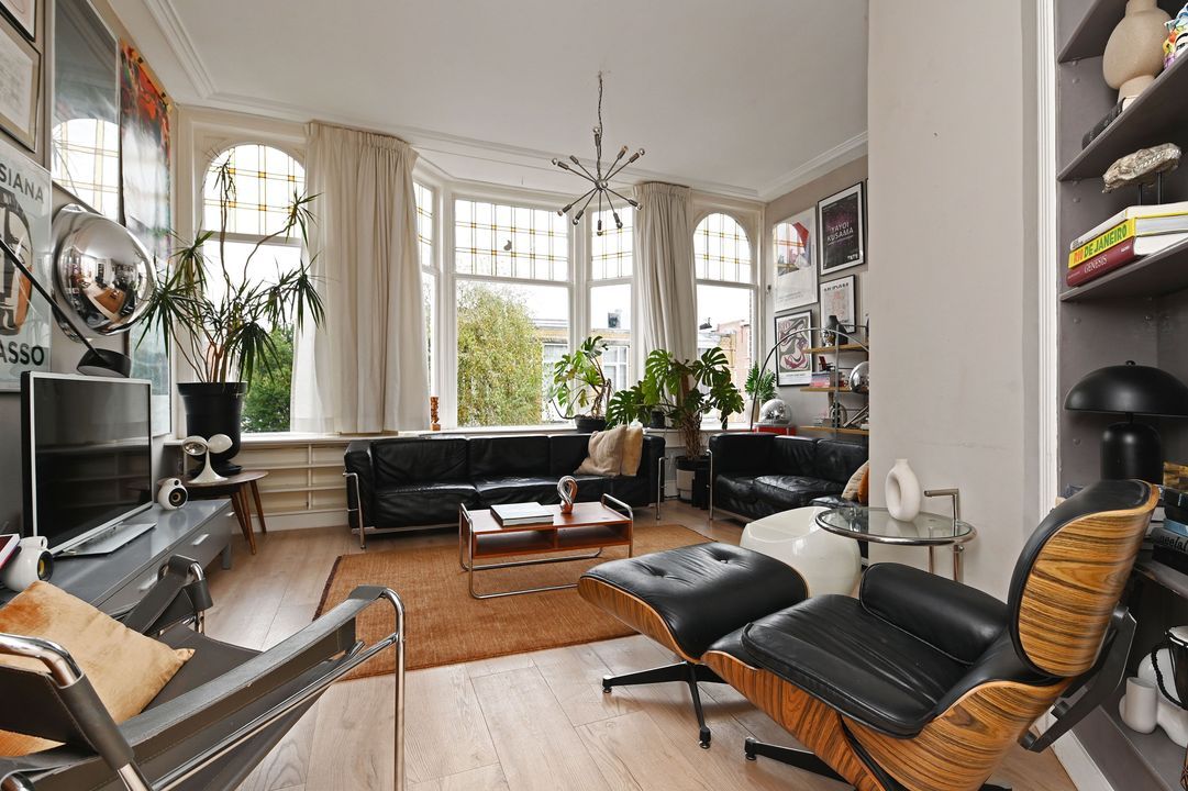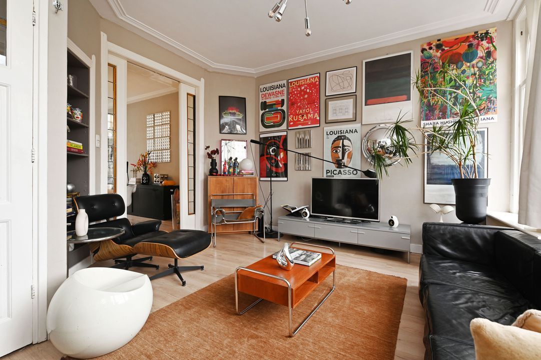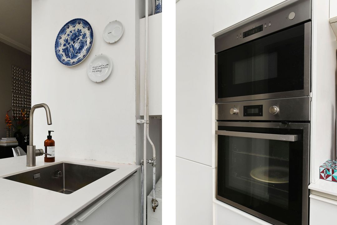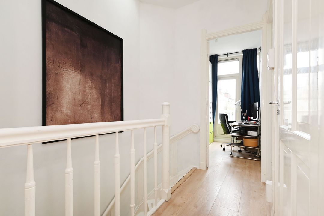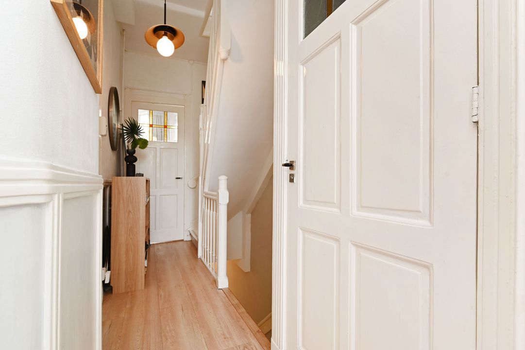 entree op straatniveau, hal met meterkast, trap naar de 1e verdieping, overloop, modern toilet met fonteintje, royale, sfeervolle L-vormige woon-eetkamer met originele schuifseparatie, vaste kasten, erker aan de voorzijde, openslaande deuren naar achterbalkon. Moderne half open keuken, van de eetkamer afgescheiden door middel van een bar. De keuken beschikt over een inbouw inductie kookplaat, magnetron, oven, vaatwasser, koel/vriescombinatie. Achterbalkon over volle breedte bereikbaar vanuit de woon/eetkamer en de keuken.
