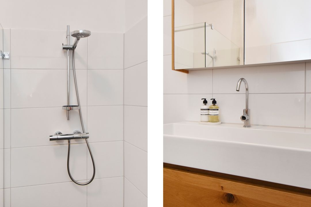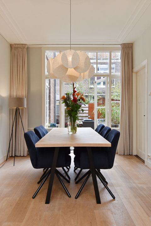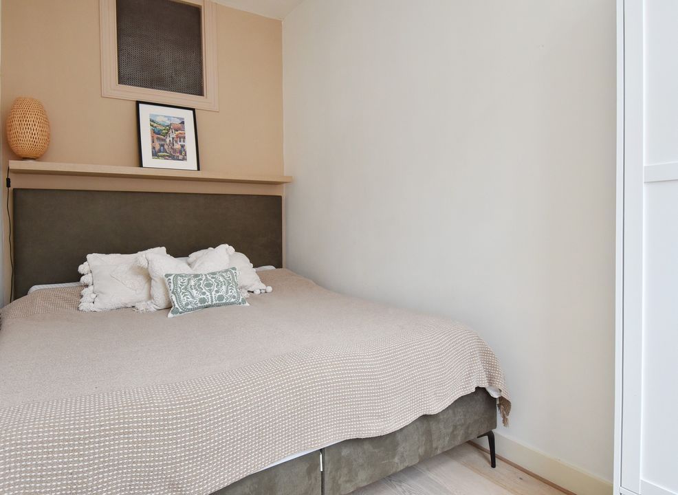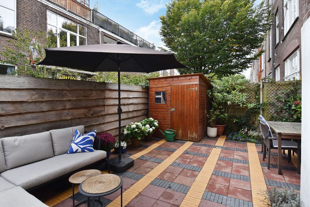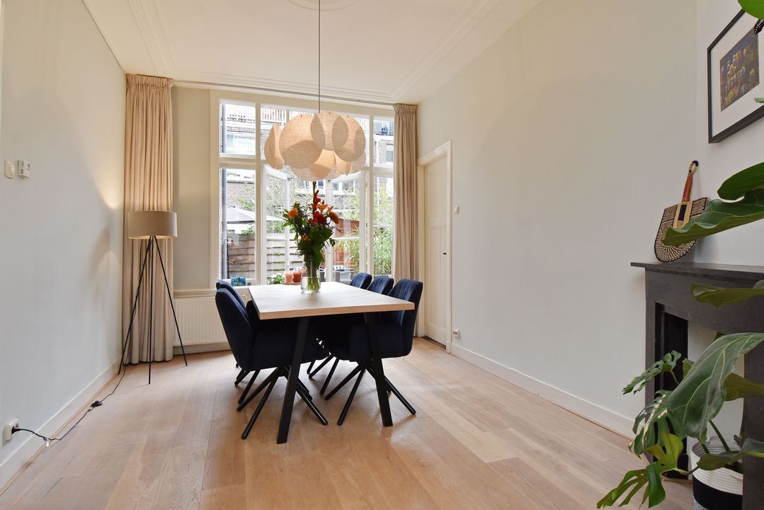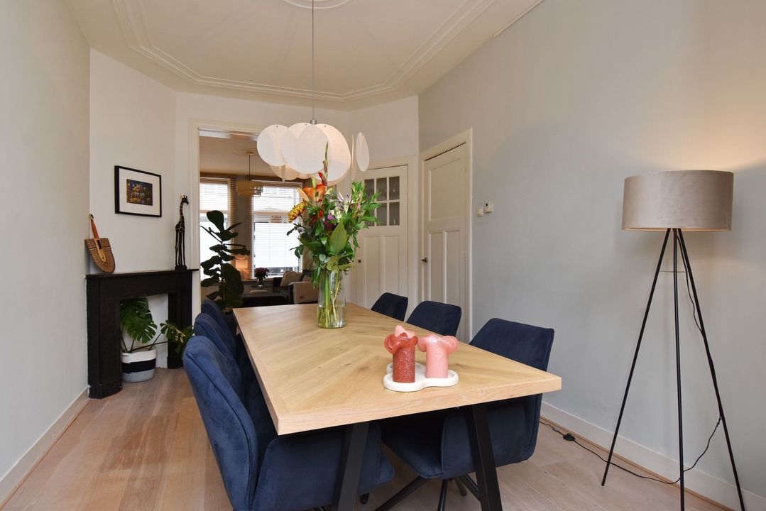 Entree woning, tochtportaal, ruime hal met fraaie granito vloer, twee grote vaste kasten en separaat toilet met fontein. Heerlijk sfeervolle en lekker lichte woon-/eetkamer ensuite met vaste kasten, lijstwerk plafonds, originele schouwen en fraaie lamel parketvloer. Vanuit de eetkamer via openslaande deuren toegang tot de zeer goed verzorgde en aangelegde ruime achtertuin met vrijstaande houten schuur. Aan de achterzijde gelegen grote keuken welke in 2022 door de huidige eigenaren is vernieuwd en voorzien is van een composiet werkblad en alle benodigde inbouwapparatuur (koelkast, inductie kookplaat met geïntegreerde afzuiging, vaatwasser en combi-oven). Ook vanuit de keuken toegang tot de tuin. Eerste slaapkamer aan de voorzijde, tweede slaap-/studeerkamer aan de achterzijde met openslaande deuren naar de tuin en tevens toegang tot de moderne badkamer met ruime inloopdouche, wastafelmeubel, handdoekradiator en opstelplaats voor de wasmachine en droger.