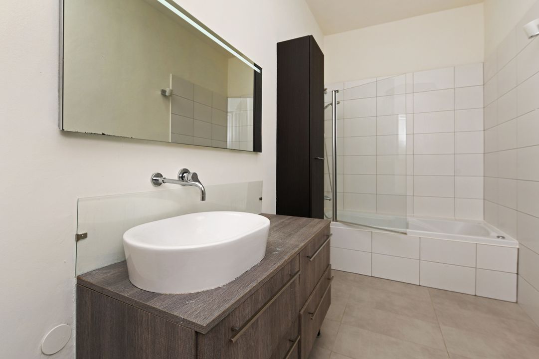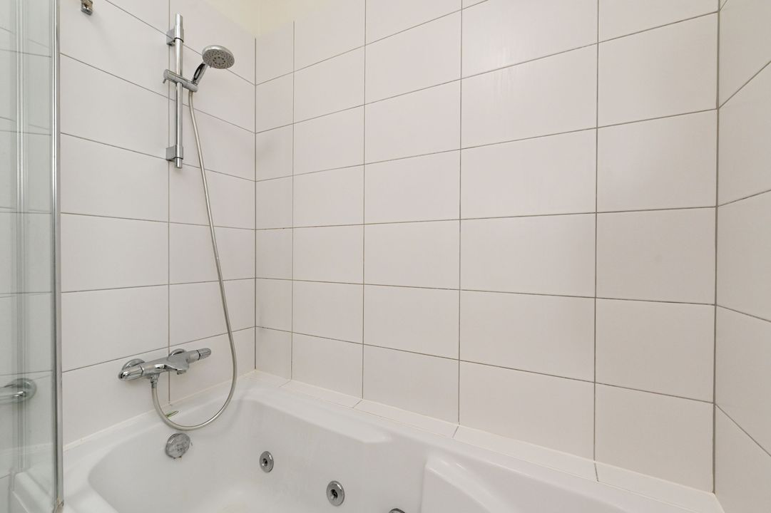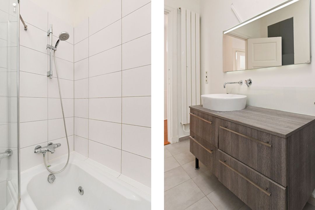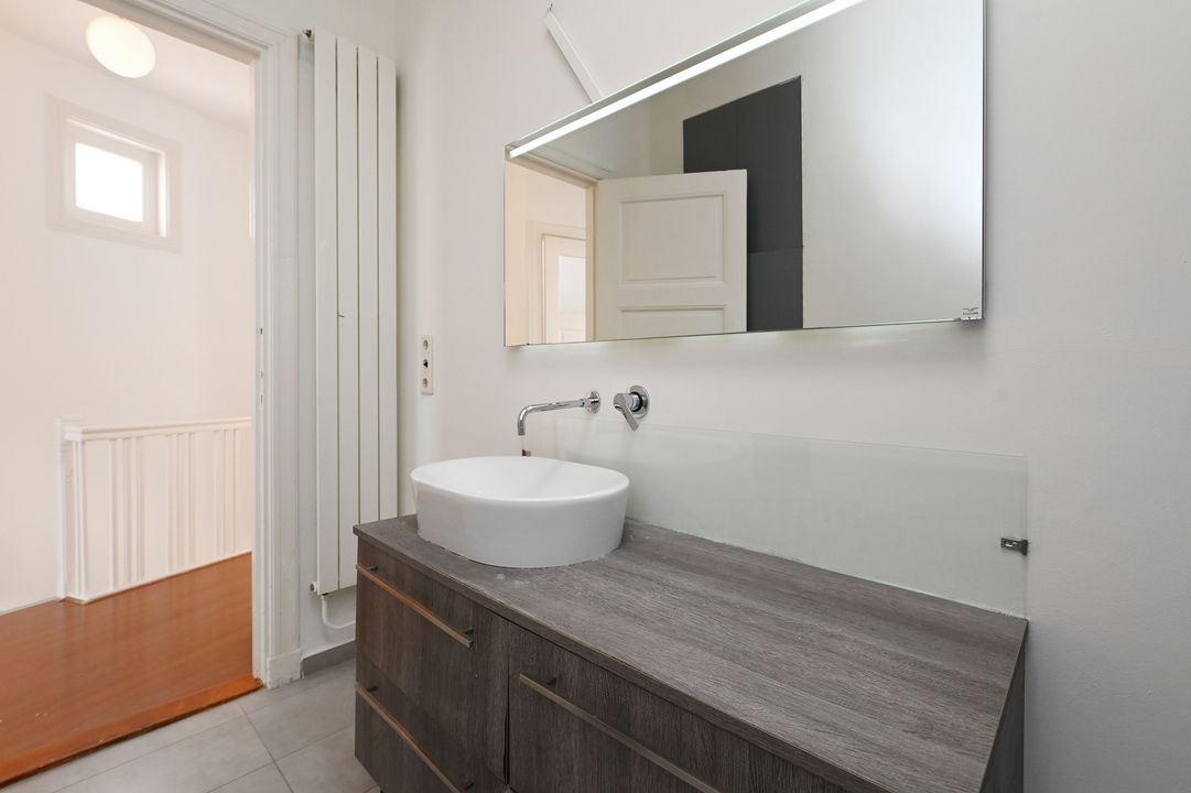 Second floor: Spacious landing, centrally located bathroom with shower, bathtub, washbasin cabinet, and connections for washing machine and dryer. Second toilet with wall-hung closet. First front bedroom: approx. 8 m². Second front bedroom: approx. 9 m² with a luxurious built-in wardrobe and original fireplace. Third rear bedroom: very spacious, approx. 21 m², with a built-in wardrobe and French doors leading to the terrace (approx. 11 m²) facing the evening sun.
