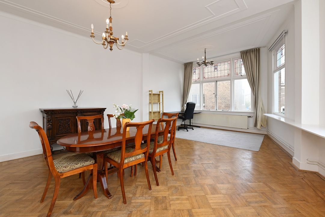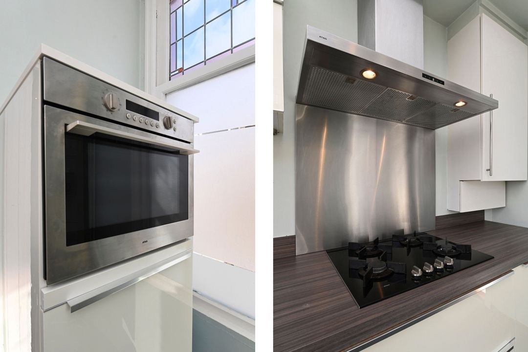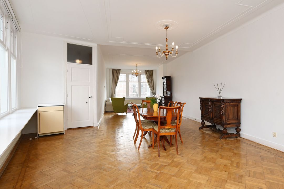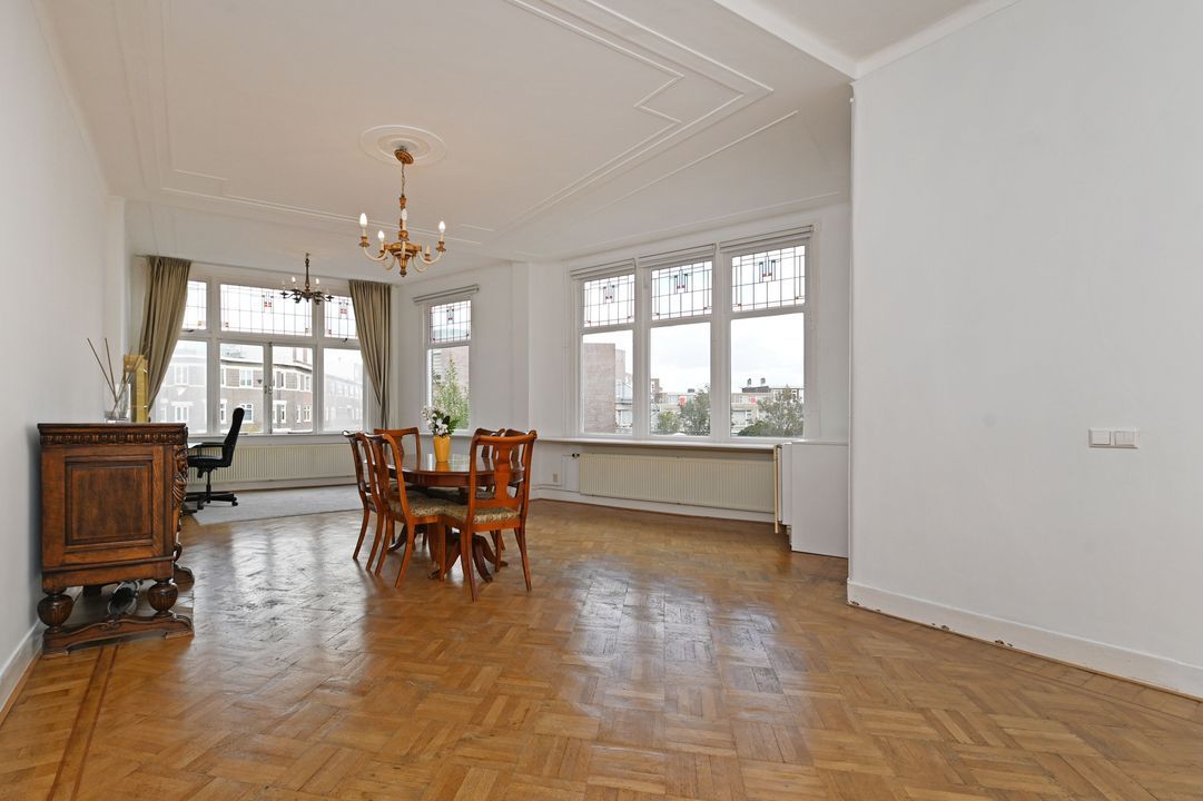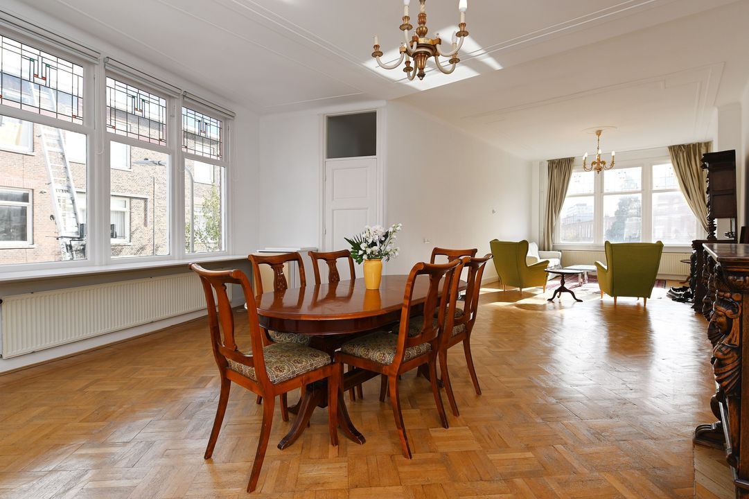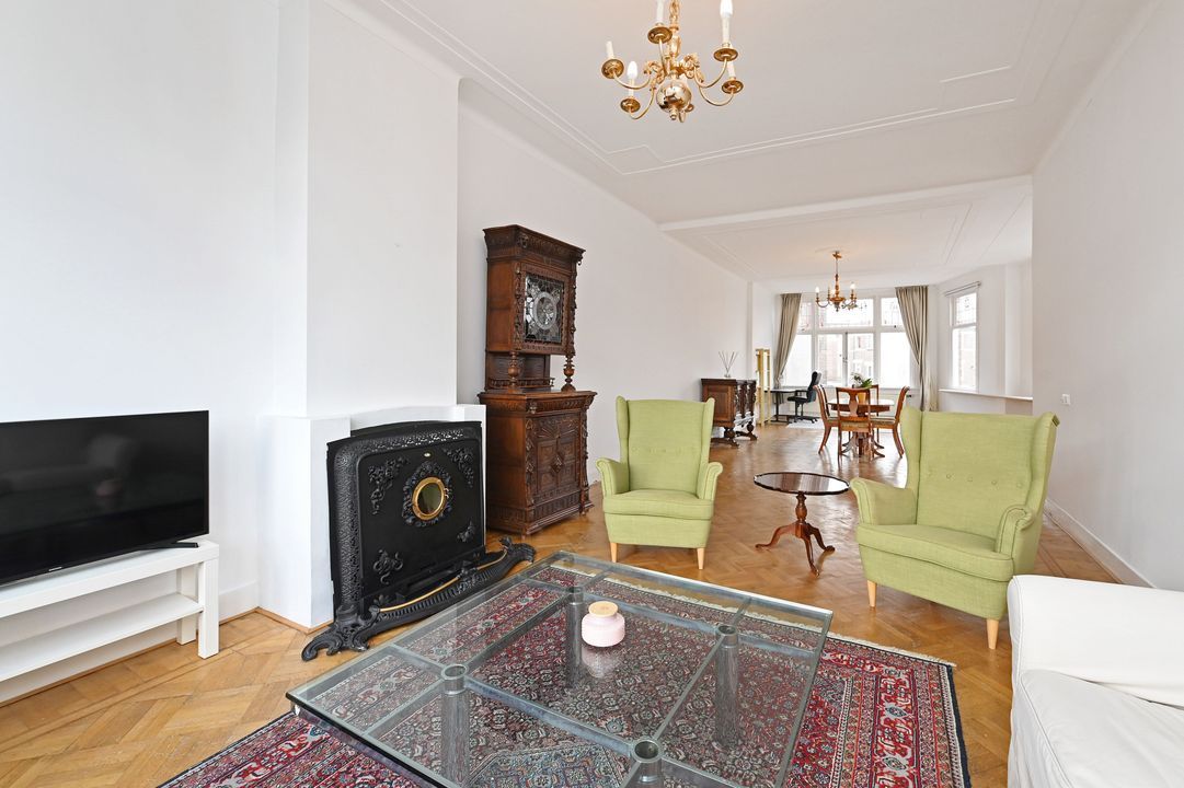 First floor: Playful landing with coat closet and modern toilet with wall-hung closet. Cozy modern kitchen (approx. 8 m²) at the front equipped with a gas hob, built-in fryer, extractor hood, dishwasher, refrigerator, and central heating boiler (Remeha 2011). The bright, open-plan living and dining room (approx. 56 m²) has an original wooden parquet floor and decorative ceilings. Thanks to the corner location, the room benefits from abundant natural light. Window frames are fitted with double glazing and stained-glass upper windows.
