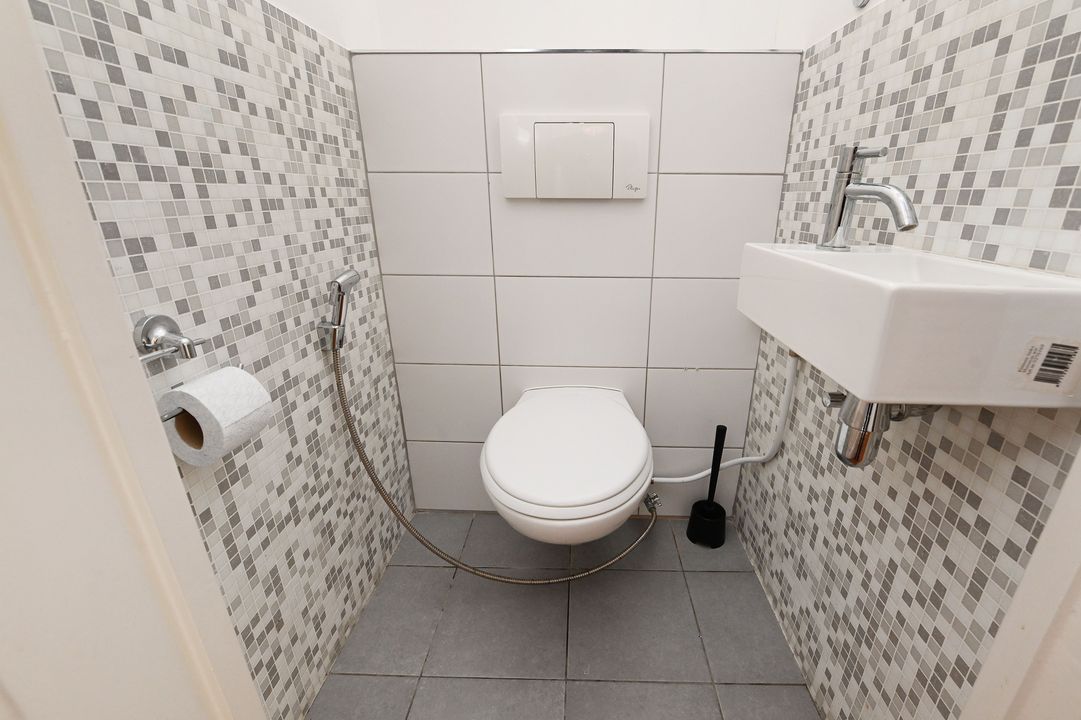 Ground floor: Entrance with a spacious hallway featuring a granite floor, built-in cupboard, and meter cupboard, with space to store approximately five bicycles.