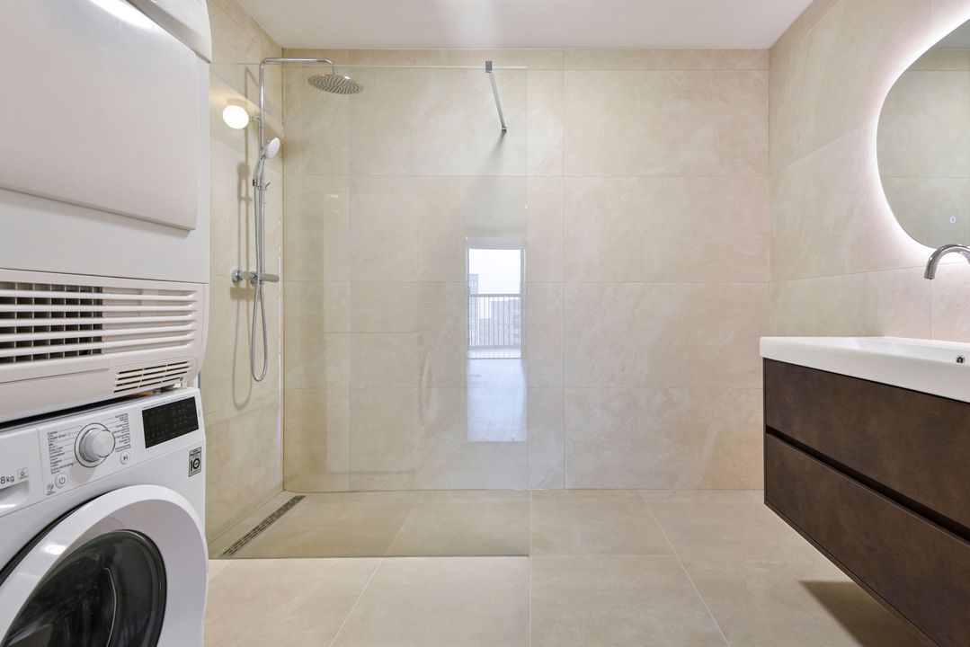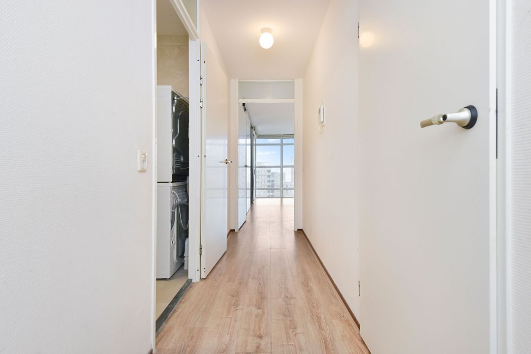 Communal entrance with video intercom, elevator to the 9th floor, entrance apartment. Large Z-shaped corridor with storage cupboards. Bright, spacious living/-dining room with great view over Scheveningen, beach and sea! Sliding doors to the loggia which can be opened partially. Kitchen with appliances (fridge, dishwasher, combi-oven, cooker and extractor fan). Large master bedroom also with access to the loggia. New en-suite bathroom with shower, hand basins and laundry. The bathroom is also accessible form the corridor. Good sized second bedroom with stunning views over The Hague city, third bedroom/study also with great views. Mew modern toilet with hand basin.