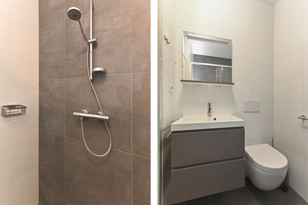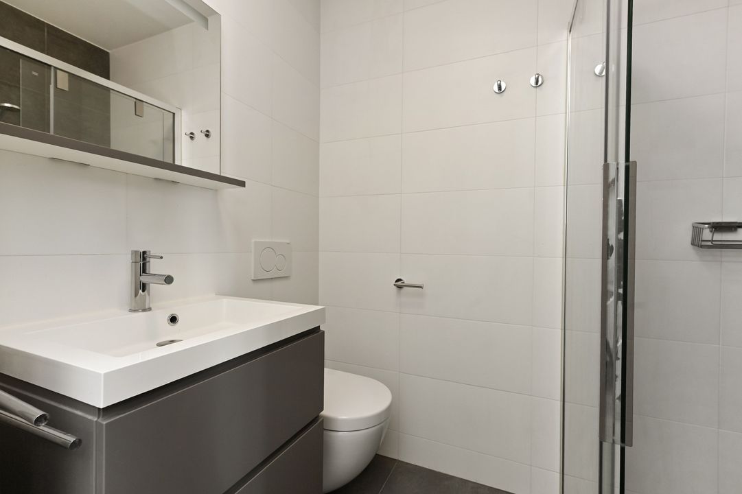 Entrance to the apartment leading into a spacious hallway with storage, separate toilet, and laundry area. Generous bedroom (approx. 4.0 x 3.5 m) with access to a balcony. Modern bathroom featuring a walk-in shower, vanity unit with washbasin, and toilet. Internal stairs to the upper floor.