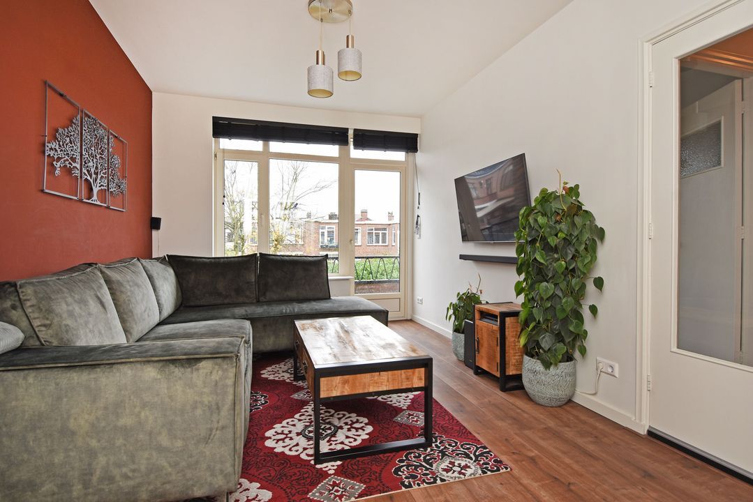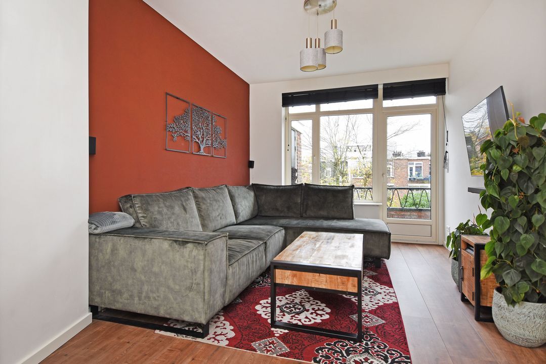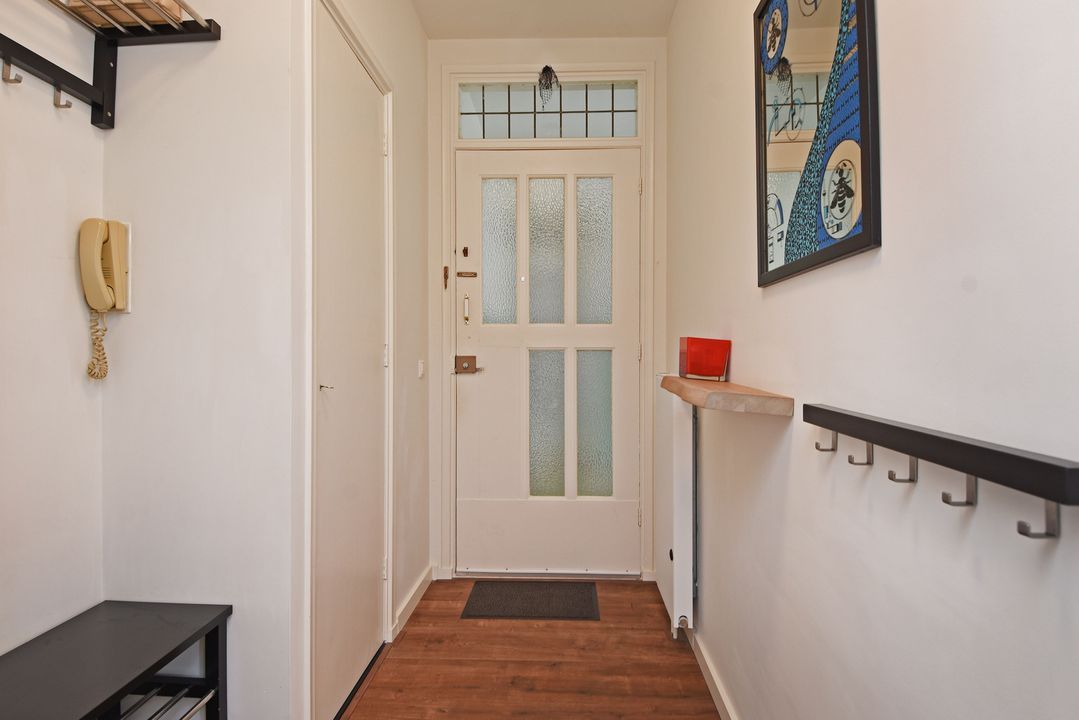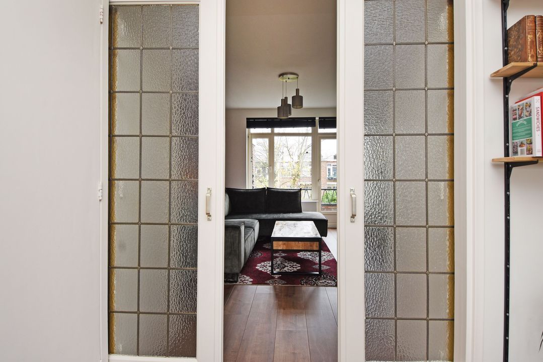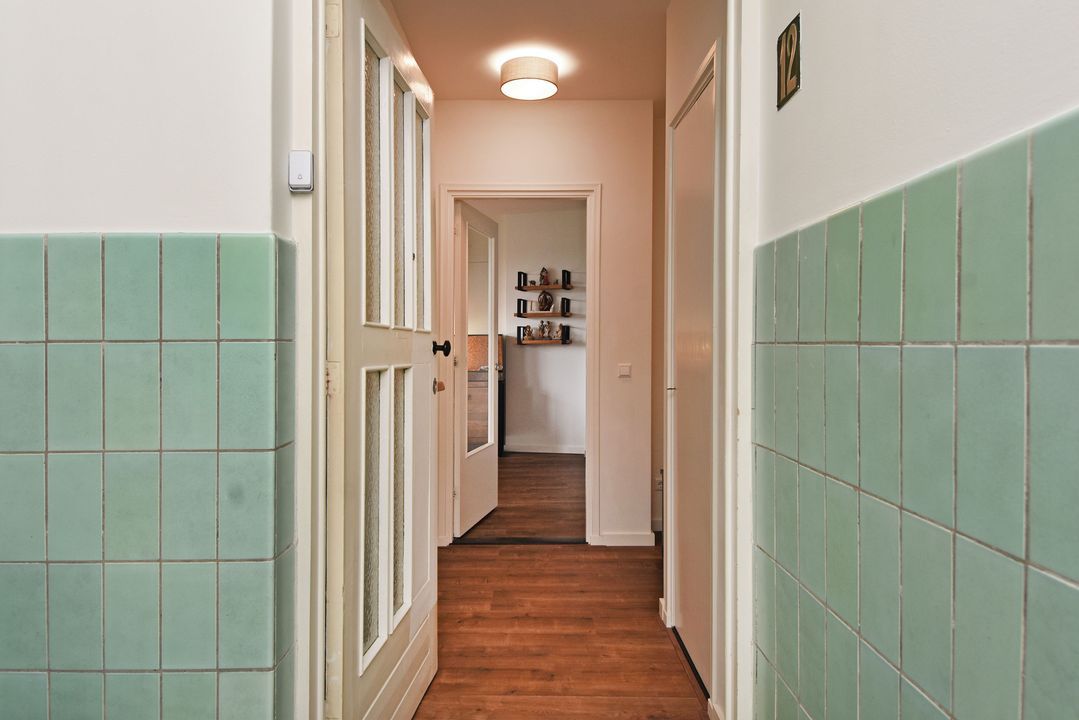 entree via gesloten portiek met brievenbussen- en bellentableau, trappenhuis, trap naar de 2e etage, entree appartement, hal met meterkast, heel lichte woon-eetkamer ensuite met schuifseparatie met glas-in-lood, 3 vaste kasten, deur naar achterbalkon. Moderne open keuken aan de voorzijde met o.a. inbouw inductie kookplaat, oven, vaatwasser en koel/vriescombinatie.