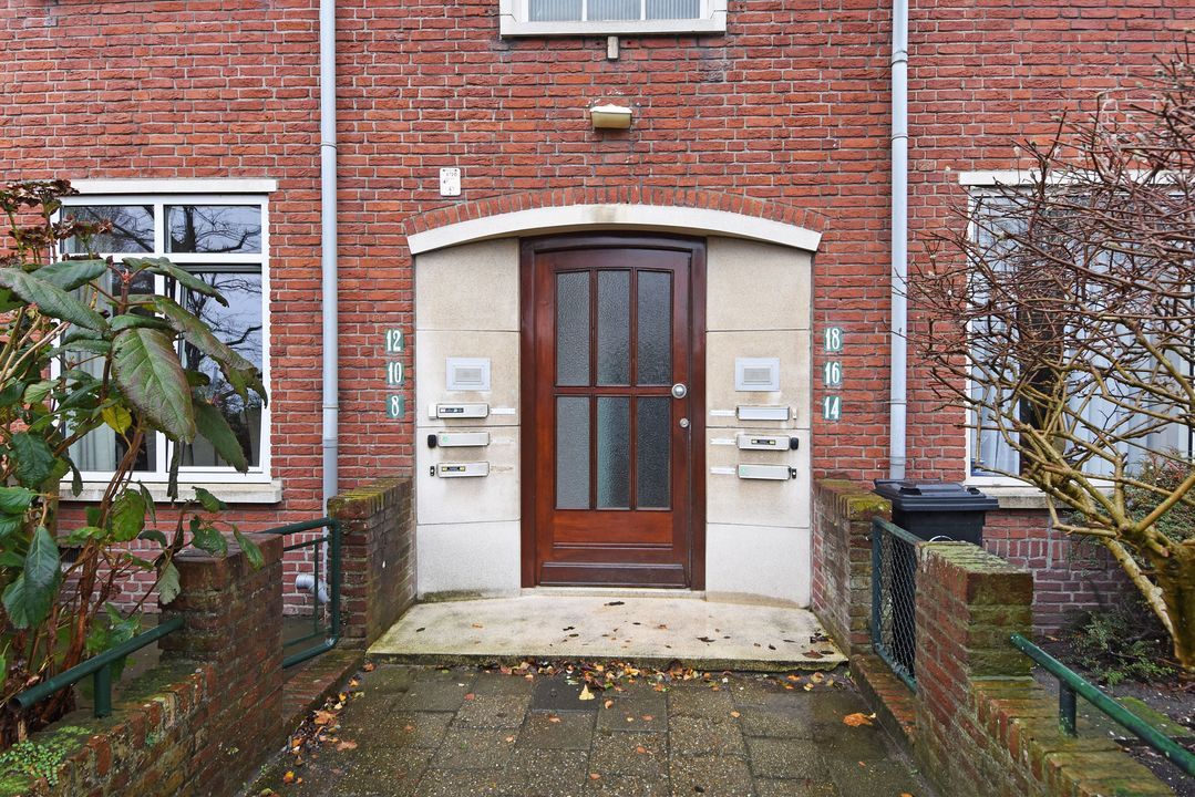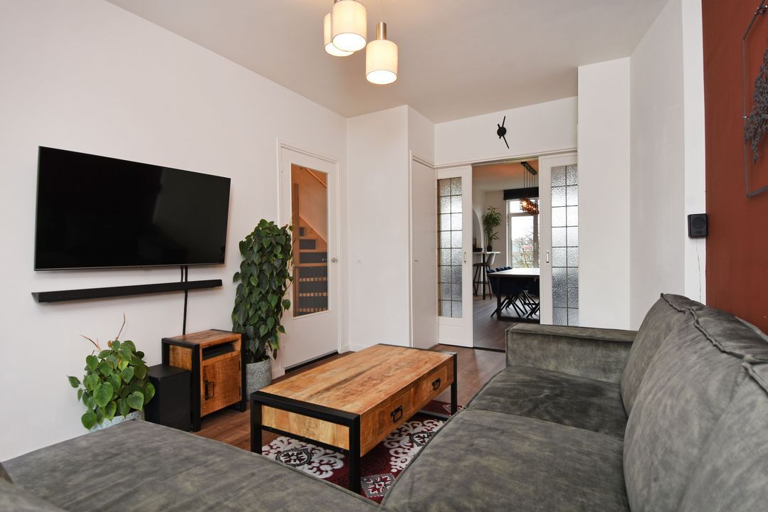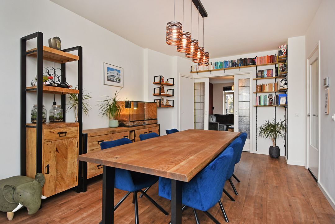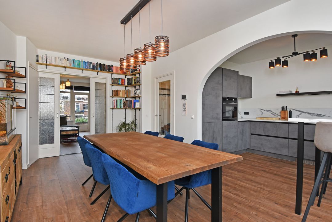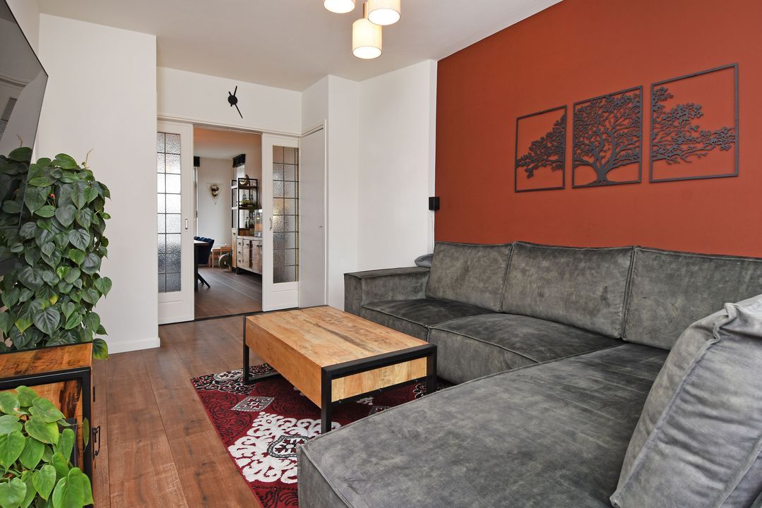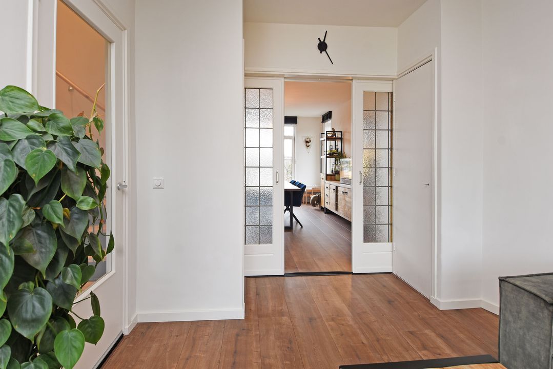 entree via gesloten portiek met brievenbussen- en bellentableau, trappenhuis, trap naar de 2e etage, entree appartement, hal met meterkast, heel lichte woon-eetkamer ensuite met schuifseparatie met glas-in-lood, 3 vaste kasten, deur naar achterbalkon. Moderne open keuken aan de voorzijde met o.a. inbouw inductie kookplaat, oven, vaatwasser en koel/vriescombinatie.