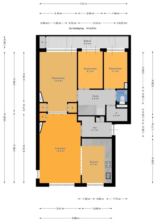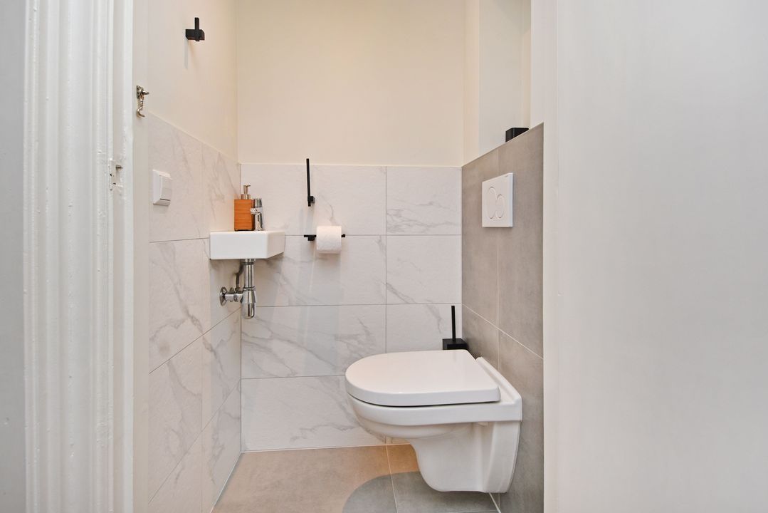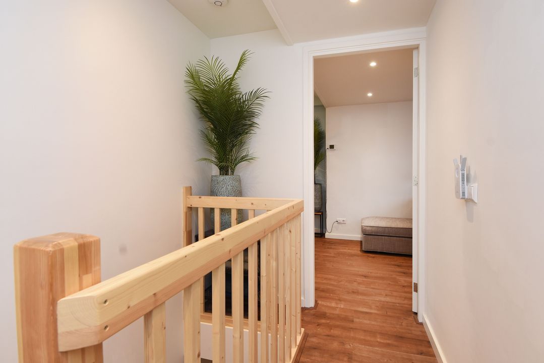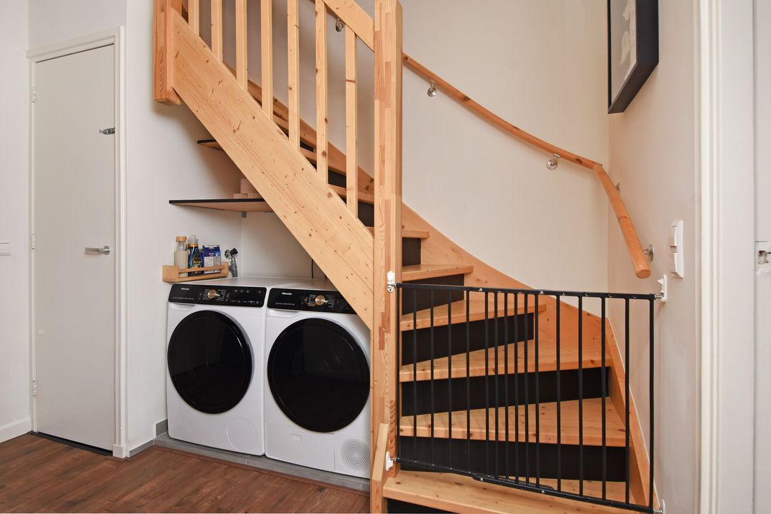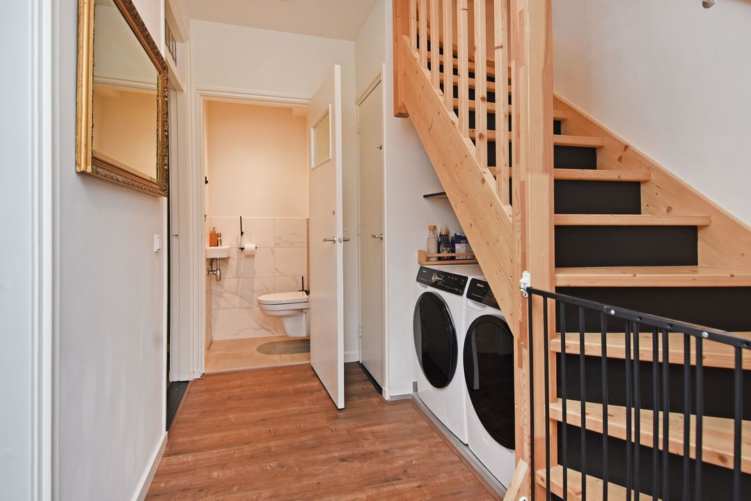 2e hal/gang met trap naar 3e etage, wasmachine- en drogeraansluiting, modern toilet met fonteintje, ruime berging, 2 slaapkamers aan de achterzijde, beide met toegang naar balkon.
