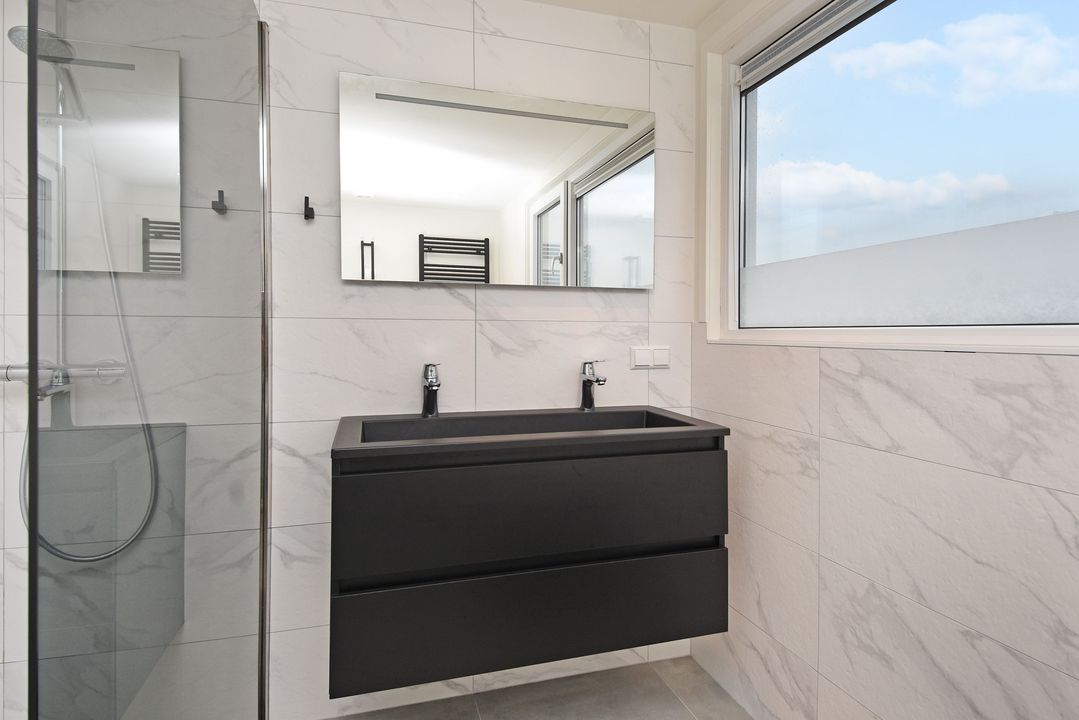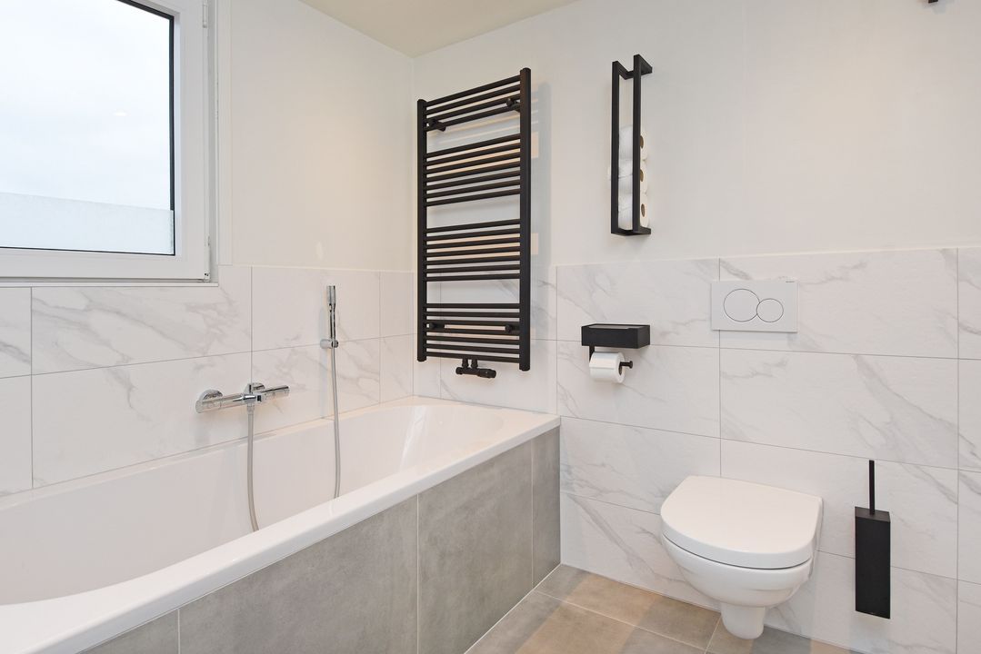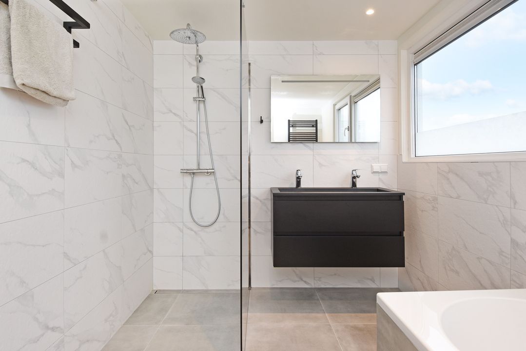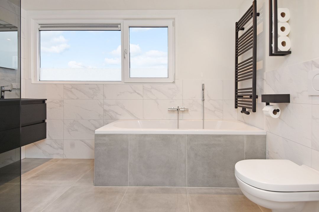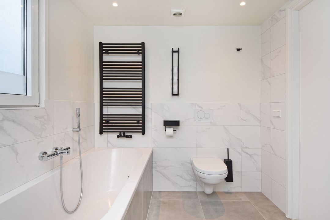 Overloop, kast met CV combiketel, moderne ruime badkamer met ligbad, inloop-douche, dubbele wastafel en toilet,