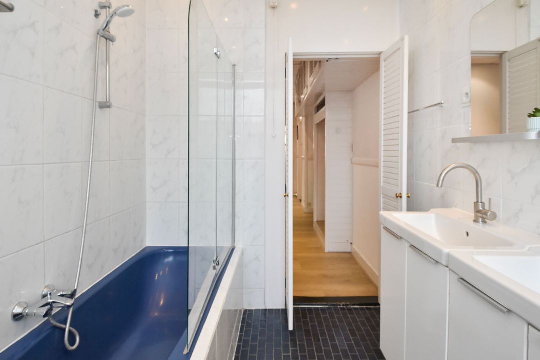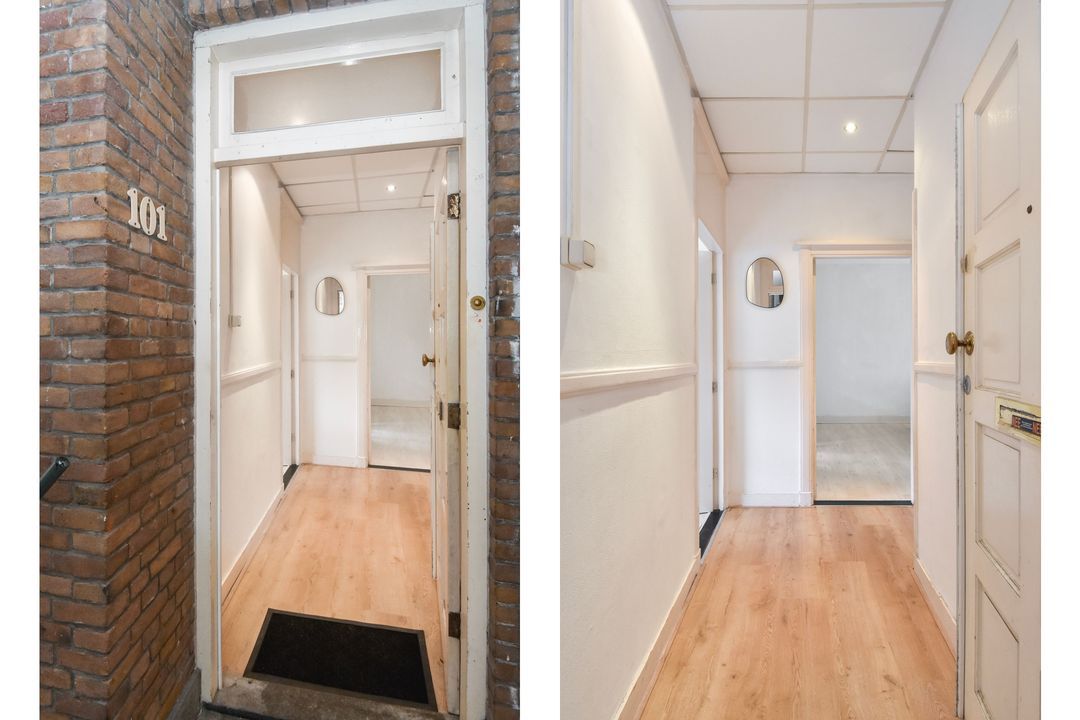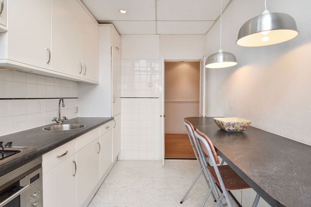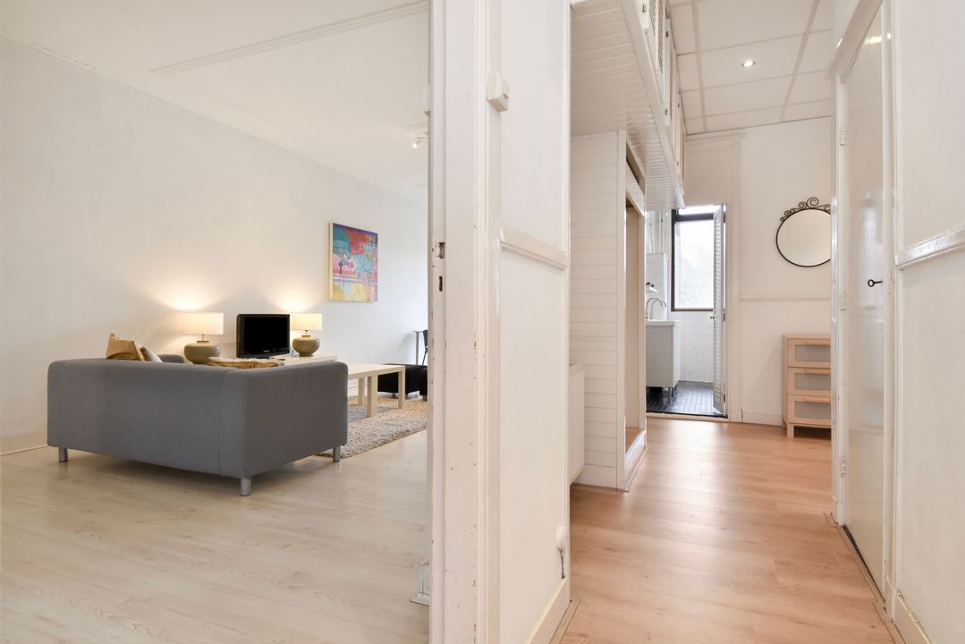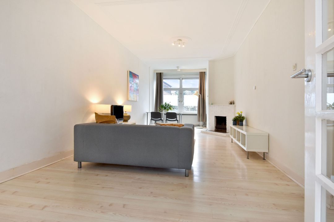 via open "Haags" portiek trap naar de eerste verdieping, entree appartement, ruime U-vormige gang, diepe meterkast mede te gebruiken als berging, toilet, bergkast, royale woon-eetkamer met open-haard (niet in gebruik), ruime voorslaapkamer, voorzijslaapkamer met kastenwand, ruime keuken met inbouw apparatuur o.a. gaskookplaat, combimagnetron, vaatwasser, koel/vriescombinatie, ontbijt bar en toegang naar achterbalkon. Badkamer met dubbele wastafel, ligbad en wasmachine aansluiting.