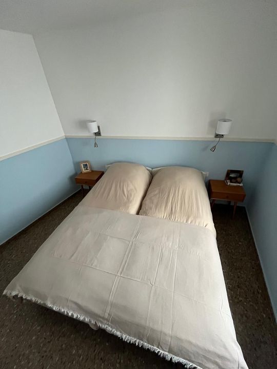 Een heerlijke lichte slaapkamer met een tweepersoonsbed, nachtkastjes een ingebouwde kledingkast en een airco (zowel warm als koud).