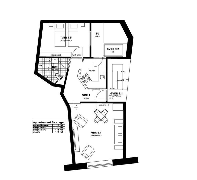 De woonkamer is volledig af te sluiten doormiddel van een schuifdeur. In de woonkamer staat een gezellige ronde eetkamertafel met 4 stoelen. Twee heerlijke fauteuils en een digitale t.v. Er staat een kledingkast, genoeg opbergruimte voor diegene die slapen op de luxe (makkelijk te openen) ruime tweepersoons 160x200 slaapbank. Ook hier hangt een airco (zowel warm als koud).