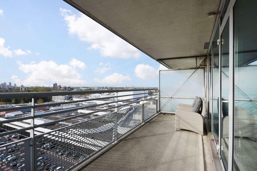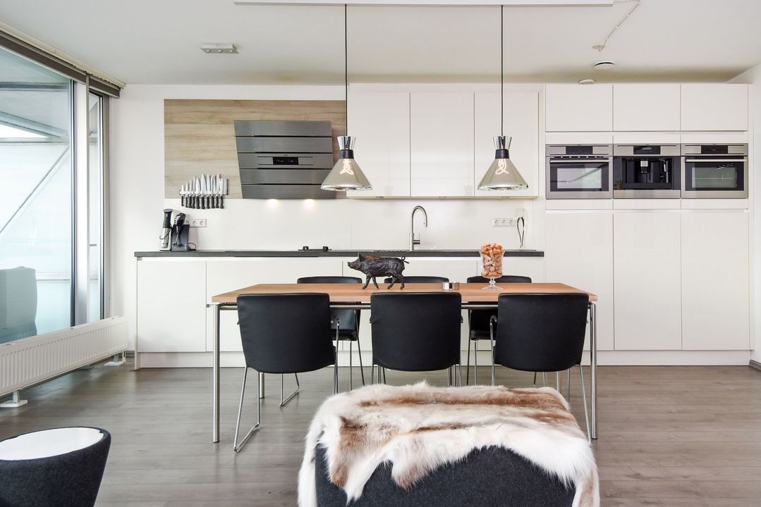 The spacious living and dining area boasts wide views over The Hague and opens onto a sunny private terrace, perfect for relaxing or entertaining. The half-open contemporary kitchen is fully equipped with a fridge, oven, microwave, cooker, and dishwasher.