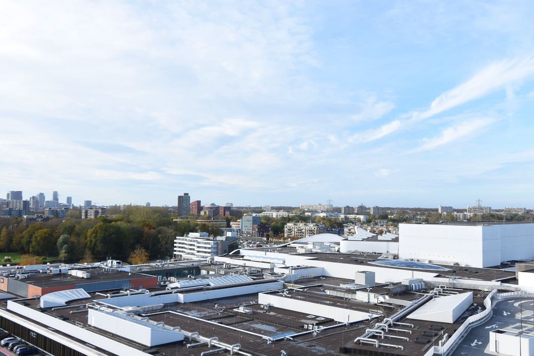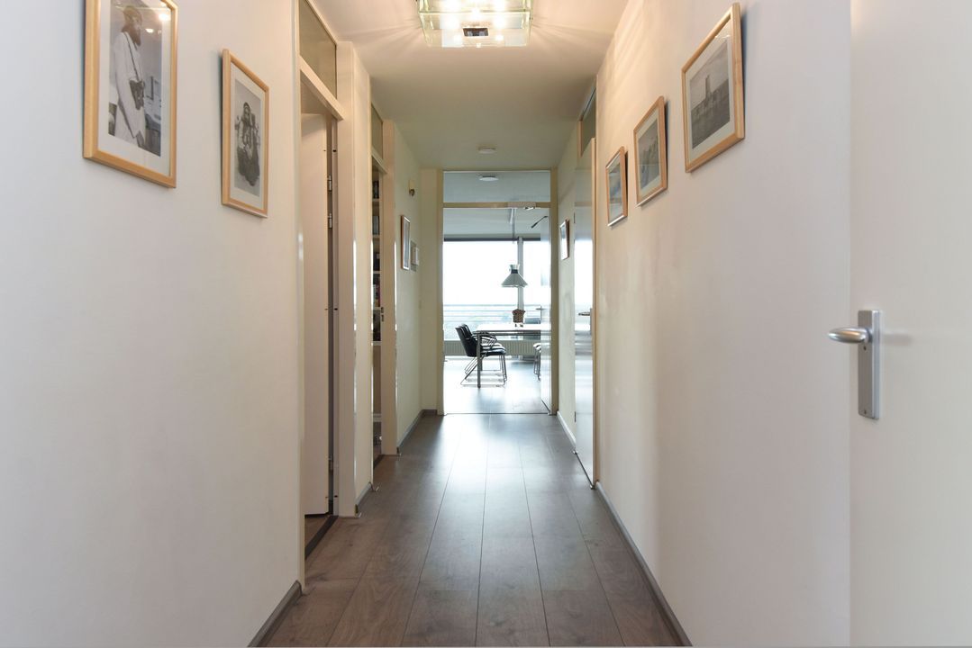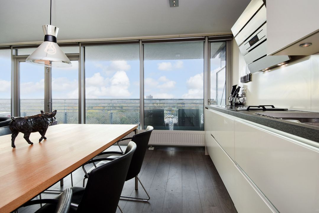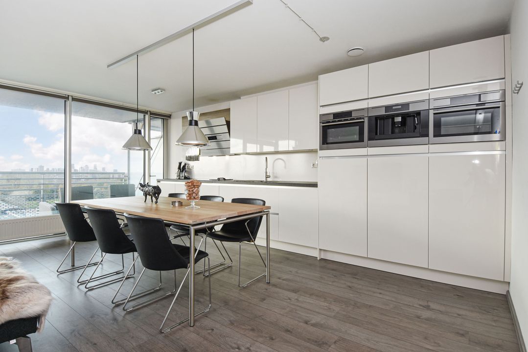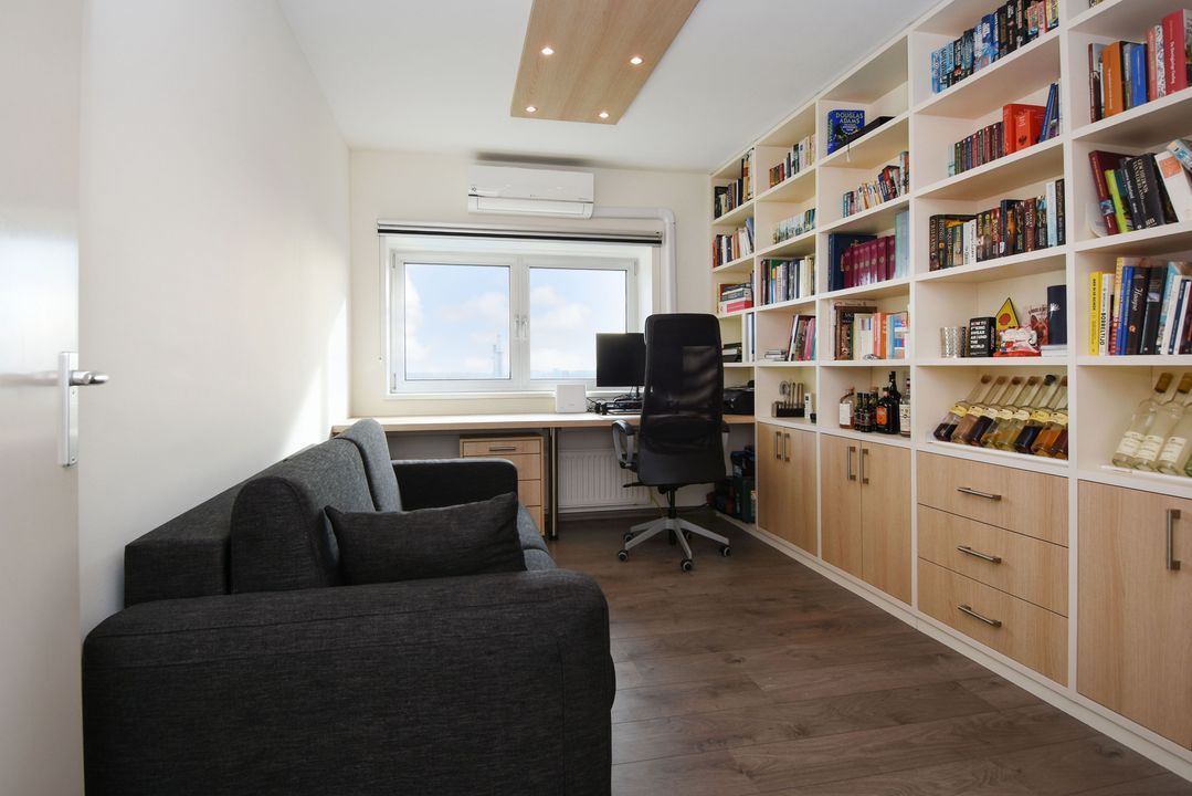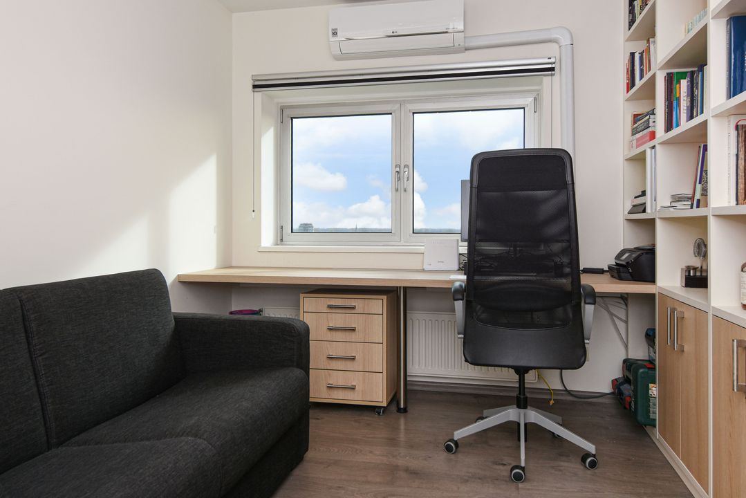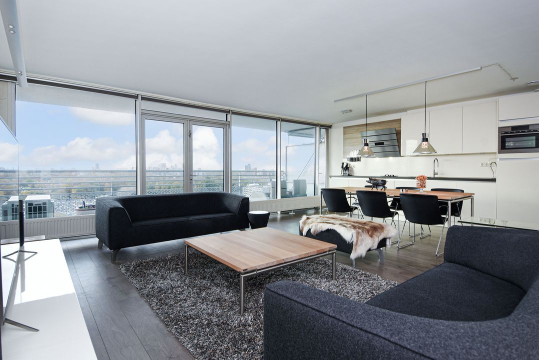 The spacious living and dining area boasts wide views over The Hague and opens onto a sunny private terrace, perfect for relaxing or entertaining. The half-open contemporary kitchen is fully equipped with a fridge, oven, microwave, cooker, and dishwasher.