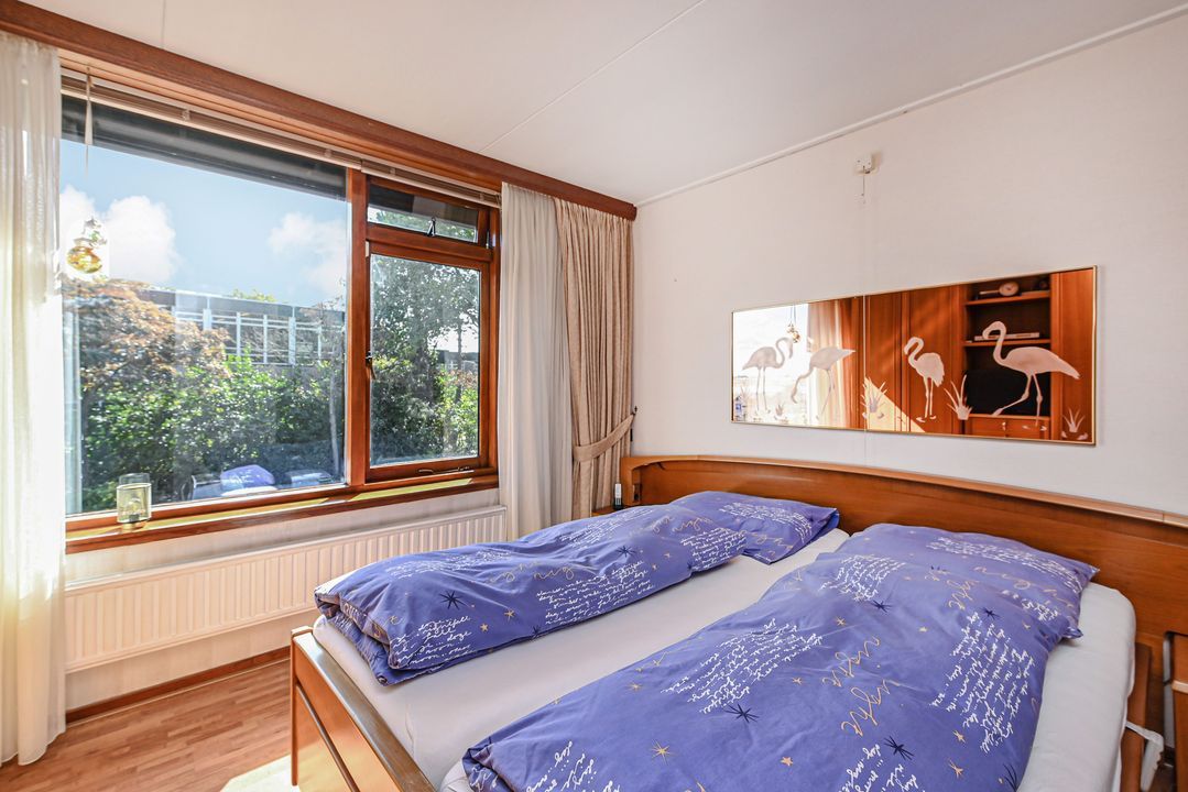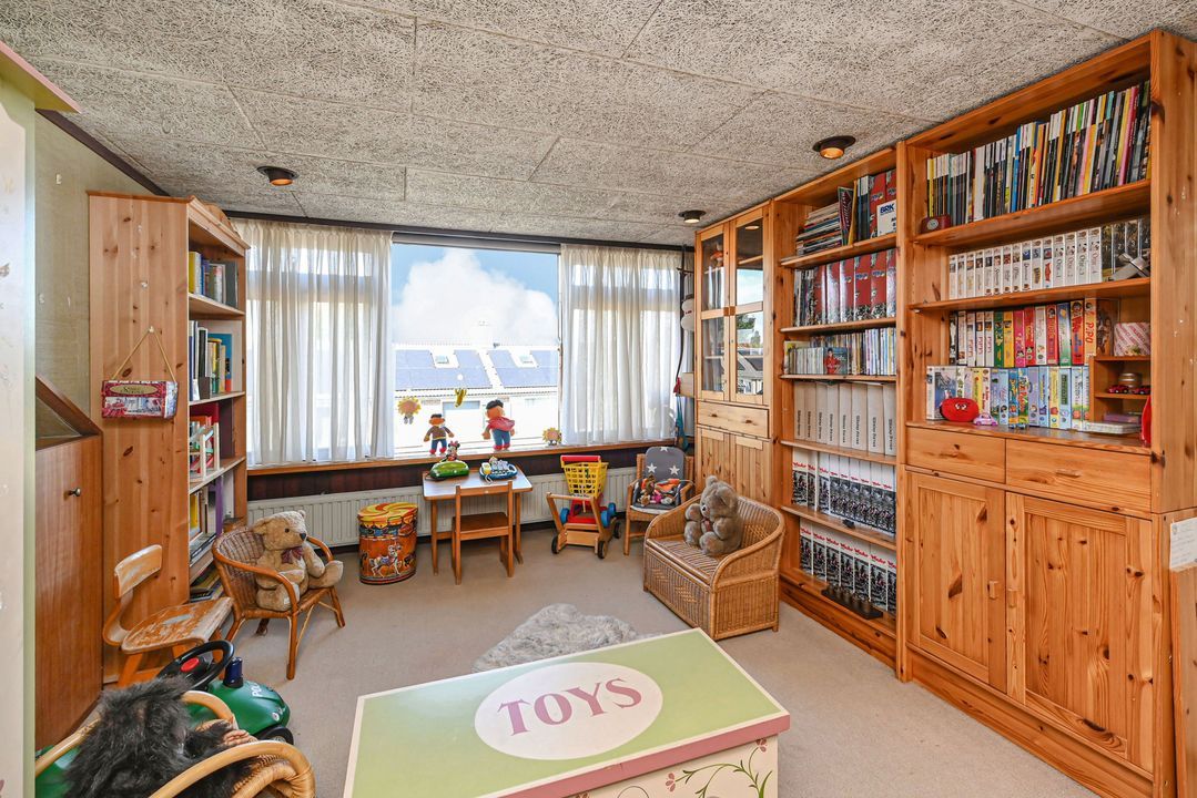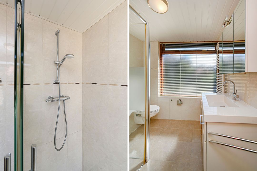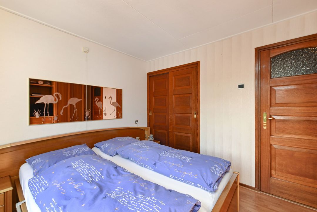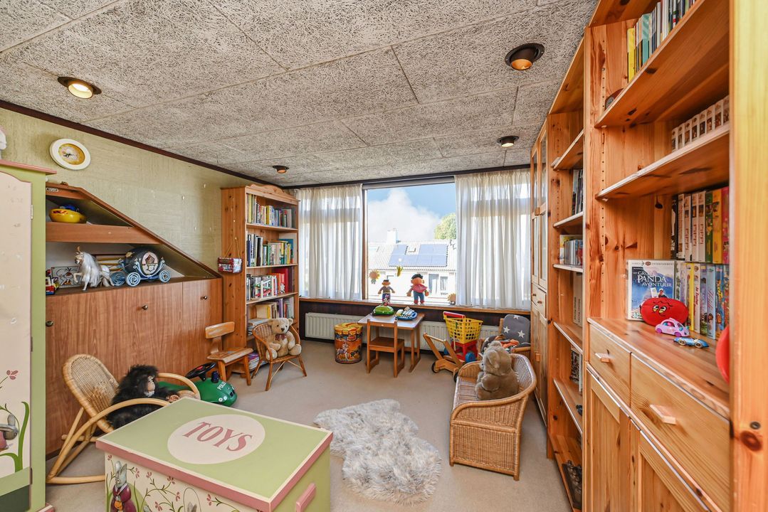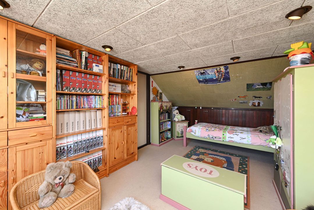 Aan de achterzijde van de woning de prima bemeten slaapkamers 2 en 3, tevens voorzien van een inbouwkast. De slaapkamers zijn voorzien van rolluiken elektrisch bediend. Via een vaste trap toegang tot de zolderetage, overloop en toegang tot slaapkamer 4. De zolder biedt veel opbergruimte, o.a. achter de knieschotten.
