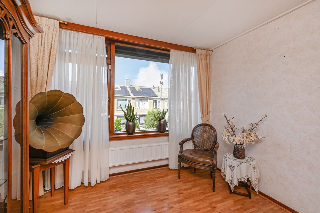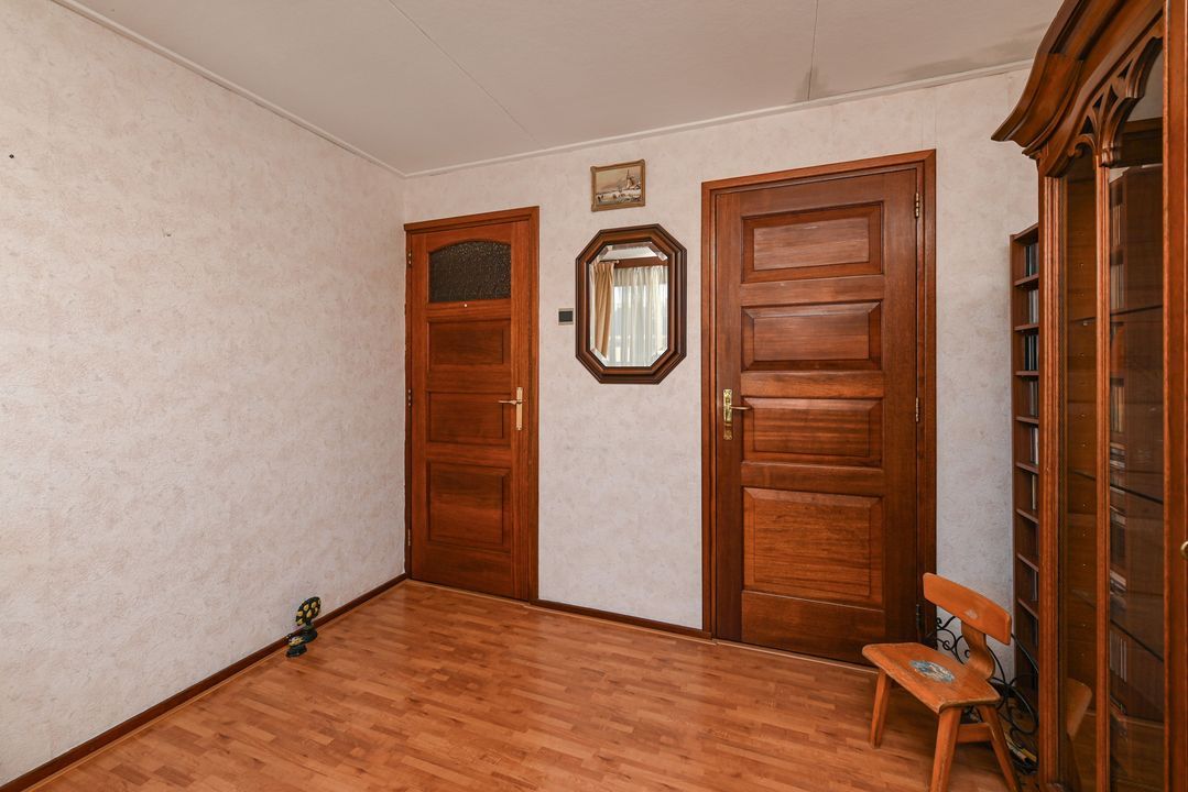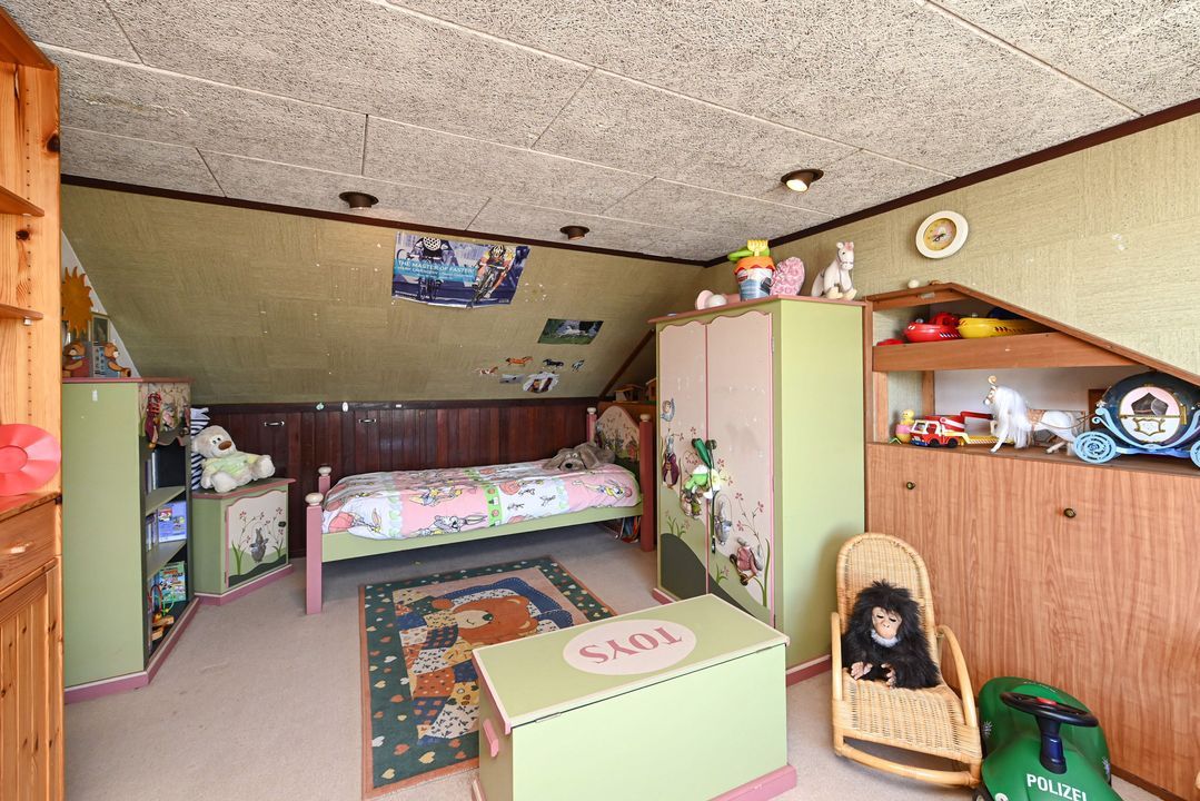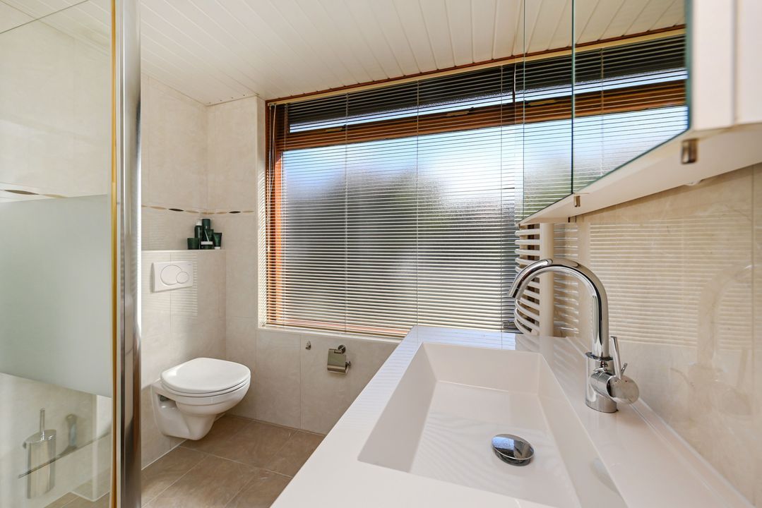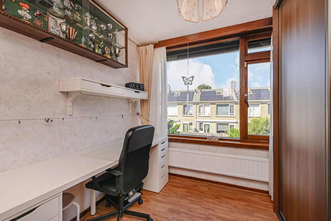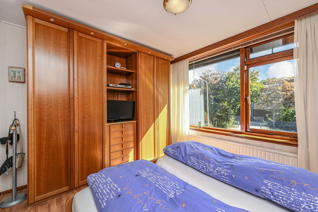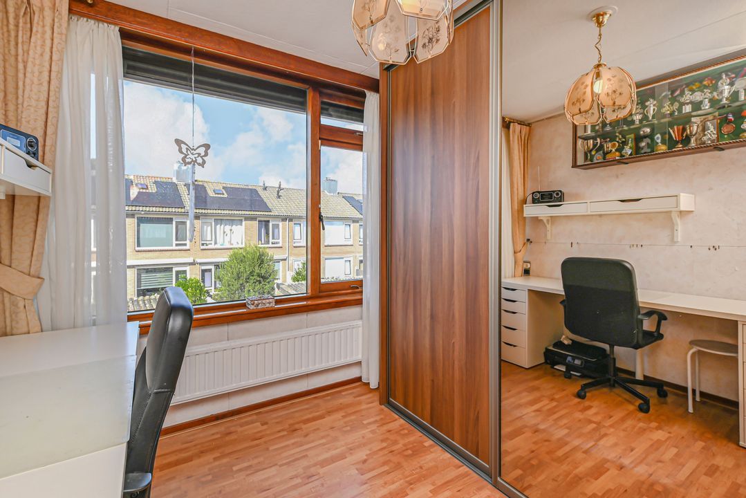 Aan de achterzijde van de woning de prima bemeten slaapkamers 2 en 3, tevens voorzien van een inbouwkast. De slaapkamers zijn voorzien van rolluiken elektrisch bediend. Via een vaste trap toegang tot de zolderetage, overloop en toegang tot slaapkamer 4. De zolder biedt veel opbergruimte, o.a. achter de knieschotten.