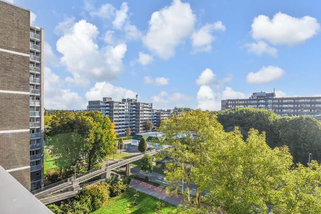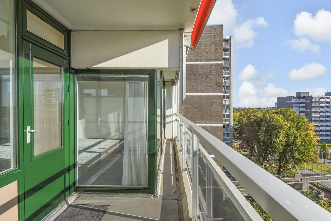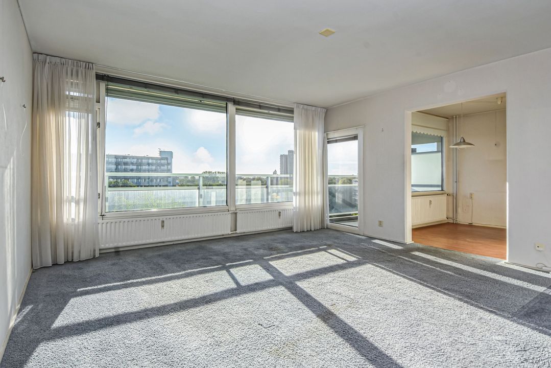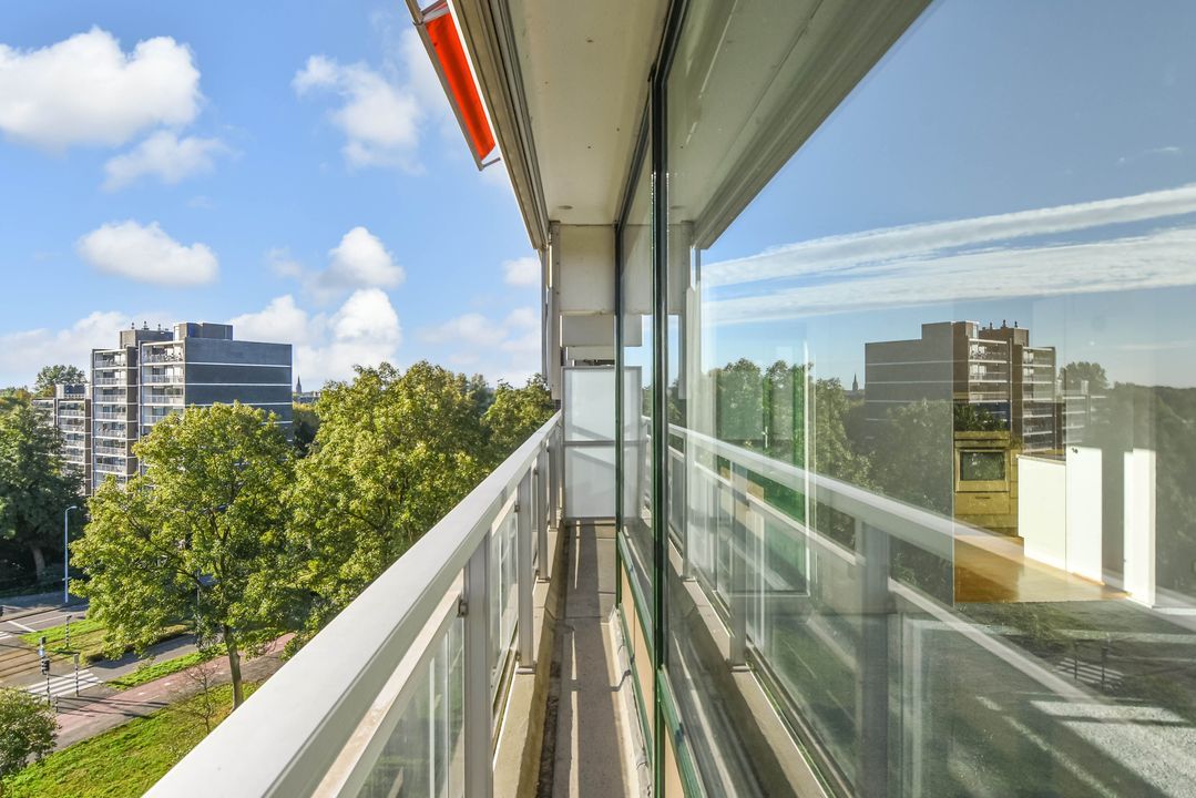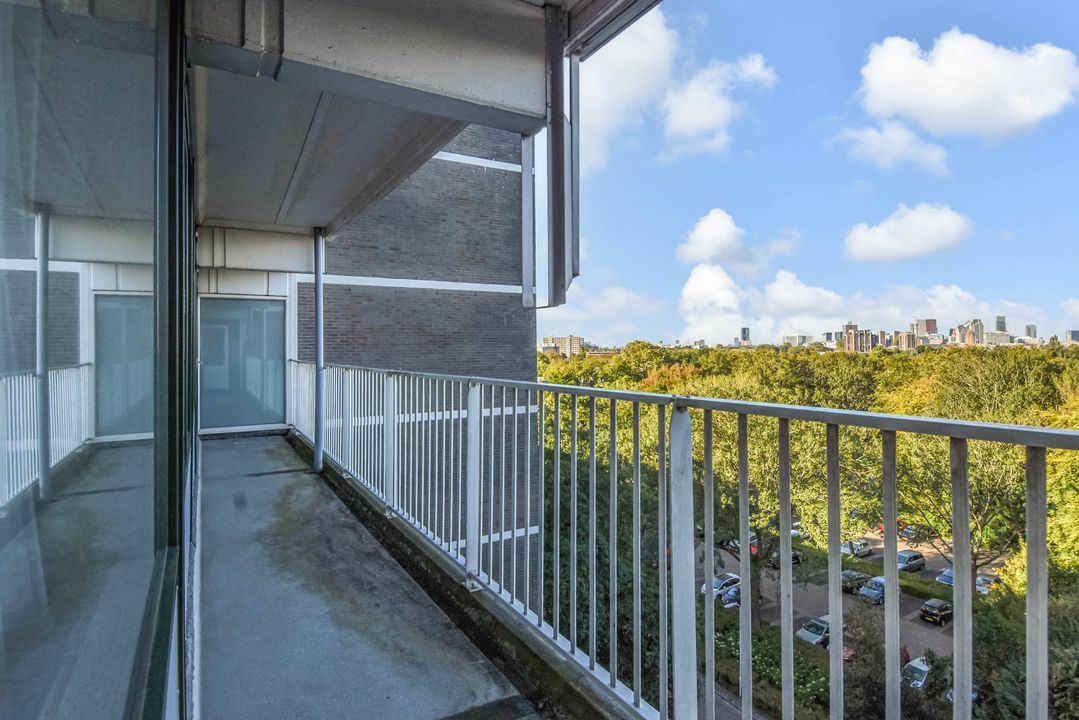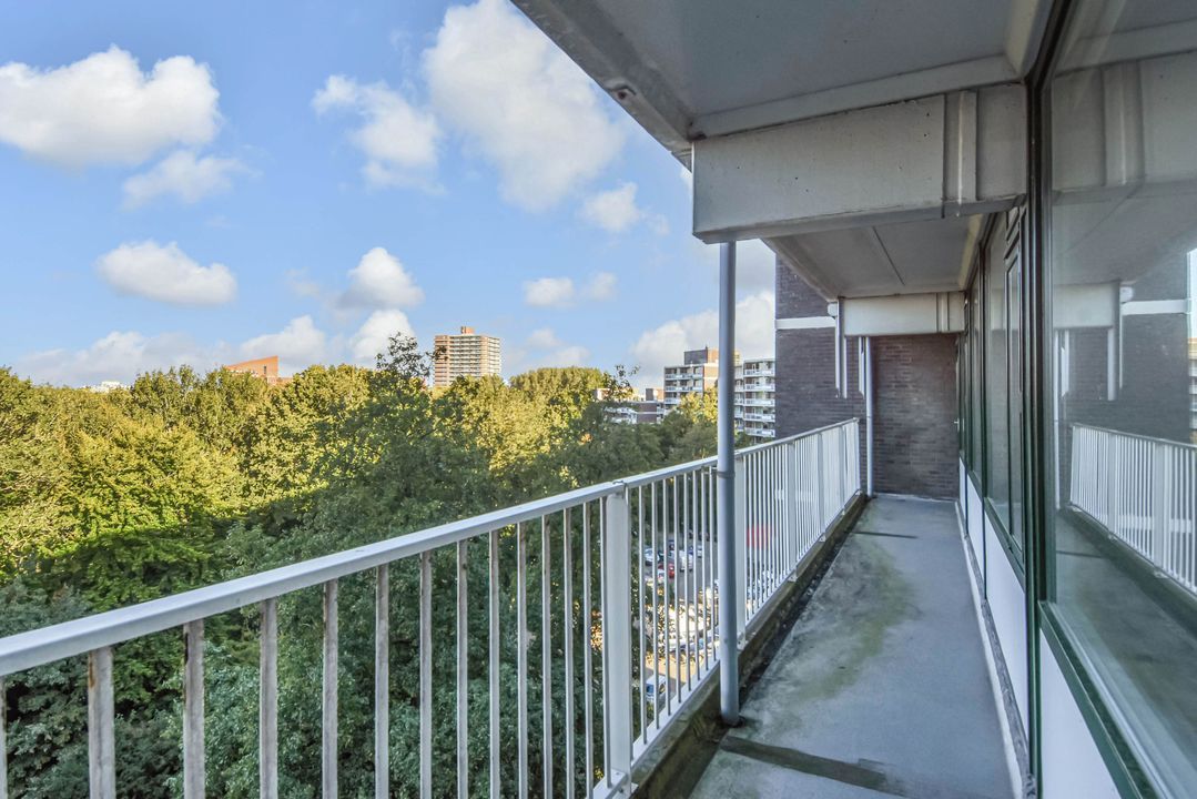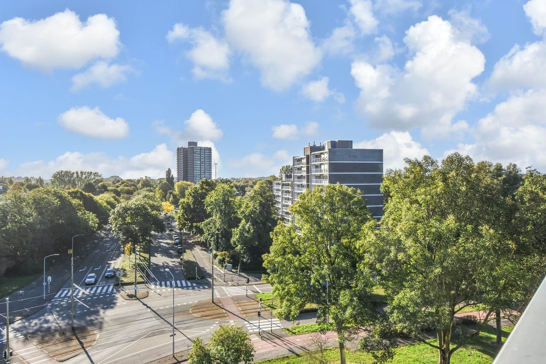 gesloten gemeenschappelijk entree met brievenbussen en video intercom, lift naar de zevende etage. Entree appartement, ruime hal met meterkast. Royale en ontzettend lichte woon-/eetkamer met aan de voorzijde vrij uitzicht over het groen en de Rodelaan en aan de achterzijde een fraai zicht op de Haagse skyline. Aan de voorzijde gelegen semi open keuken met blok aan weerszijden, diepe vaste kast en diverse inbouwapparatuur (koelkast, vriezer, oven, magnetron, vaatwasser, gaskookplaat en afzuigkap). Vanuit de keuken toegang tot her eerste ruime balkon met uitzicht over het groen en de ochtend- en middagzon. Het tweede balkon is vanuit de eetkamer bereikbaar, heeft fraai uitzicht op de skyline en heeft zon in de latere middag/avond. Royale hoofdslaapkamer van 19m2. Tweede goed formaat slaapkamer van ca. 12mw met vaste wastafel. Nette badkamer voorzien van hoekdouche met glazen wand, vaste wastafel in meubel en wasmachine aansluiting. Separaat net toilet met fontein. Het appartement beschikt over een eigen (fietsen)berging op de begane grond.