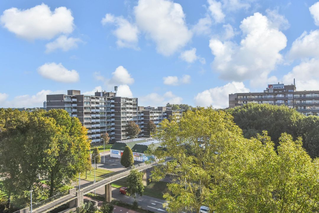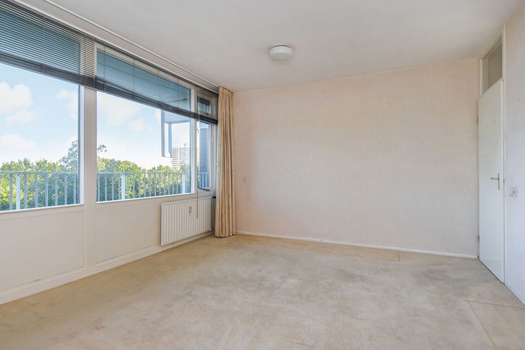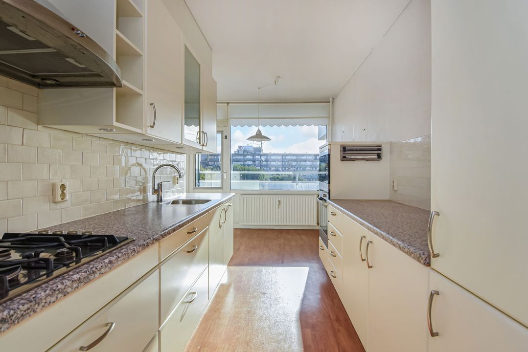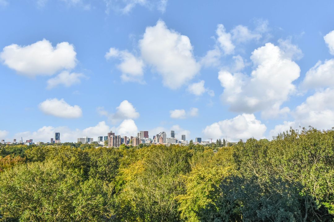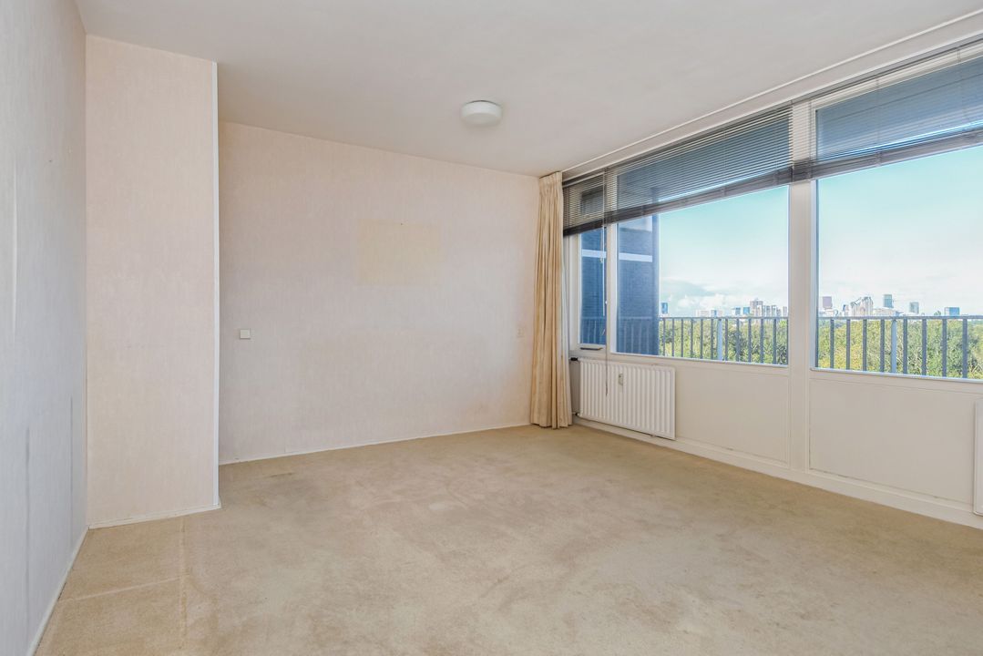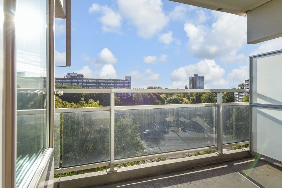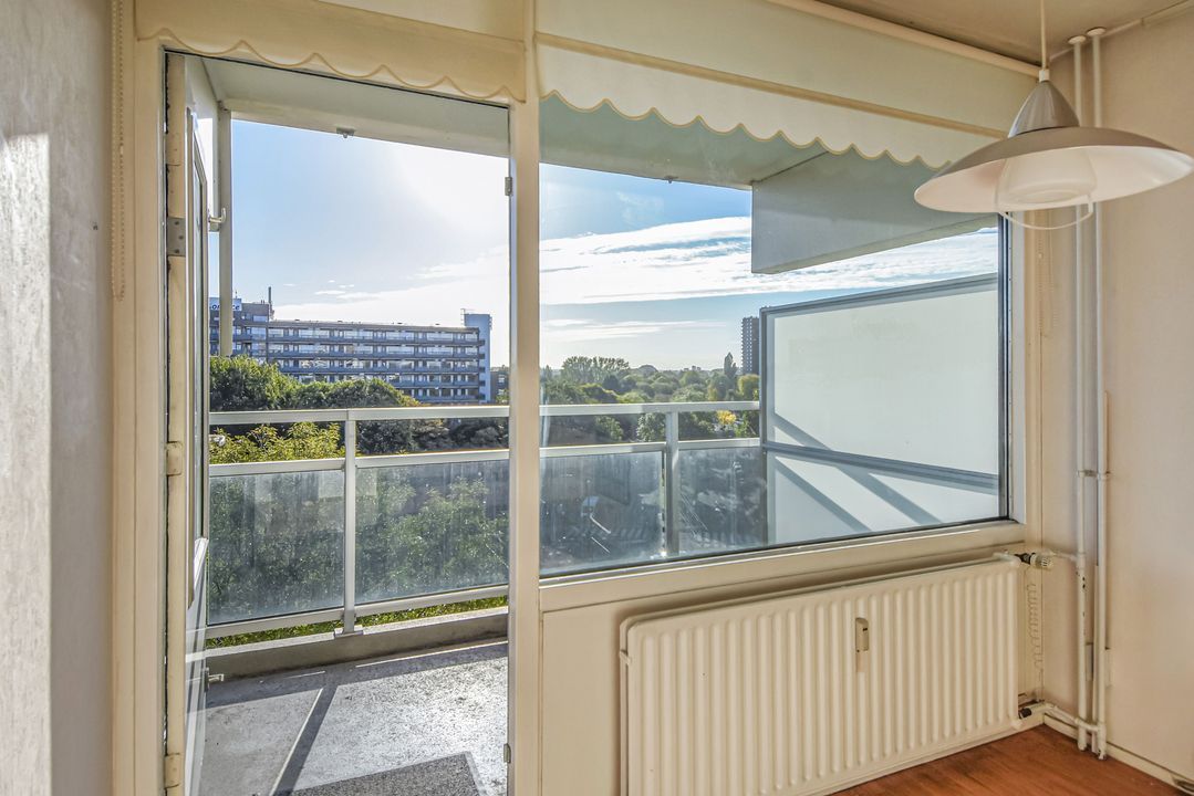 gesloten gemeenschappelijk entree met brievenbussen en video intercom, lift naar de zevende etage. Entree appartement, ruime hal met meterkast. Royale en ontzettend lichte woon-/eetkamer met aan de voorzijde vrij uitzicht over het groen en de Rodelaan en aan de achterzijde een fraai zicht op de Haagse skyline. Aan de voorzijde gelegen semi open keuken met blok aan weerszijden, diepe vaste kast en diverse inbouwapparatuur (koelkast, vriezer, oven, magnetron, vaatwasser, gaskookplaat en afzuigkap). Vanuit de keuken toegang tot her eerste ruime balkon met uitzicht over het groen en de ochtend- en middagzon. Het tweede balkon is vanuit de eetkamer bereikbaar, heeft fraai uitzicht op de skyline en heeft zon in de latere middag/avond. Royale hoofdslaapkamer van 19m2. Tweede goed formaat slaapkamer van ca. 12mw met vaste wastafel. Nette badkamer voorzien van hoekdouche met glazen wand, vaste wastafel in meubel en wasmachine aansluiting. Separaat net toilet met fontein. Het appartement beschikt over een eigen (fietsen)berging op de begane grond.