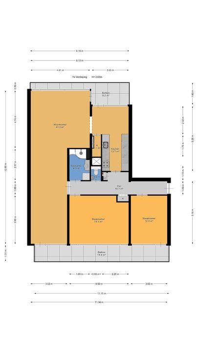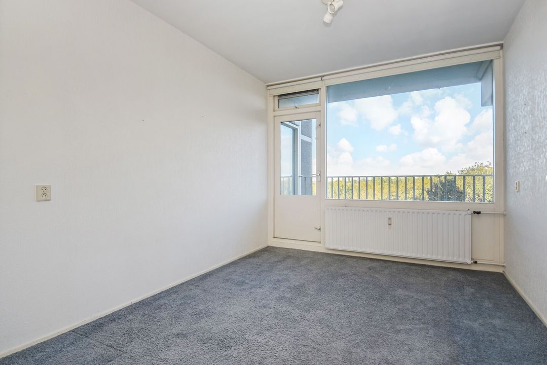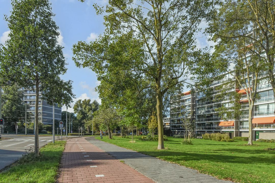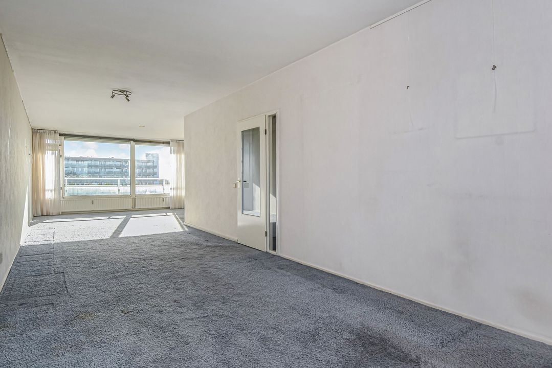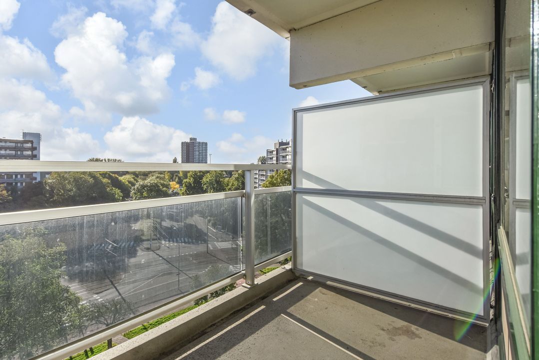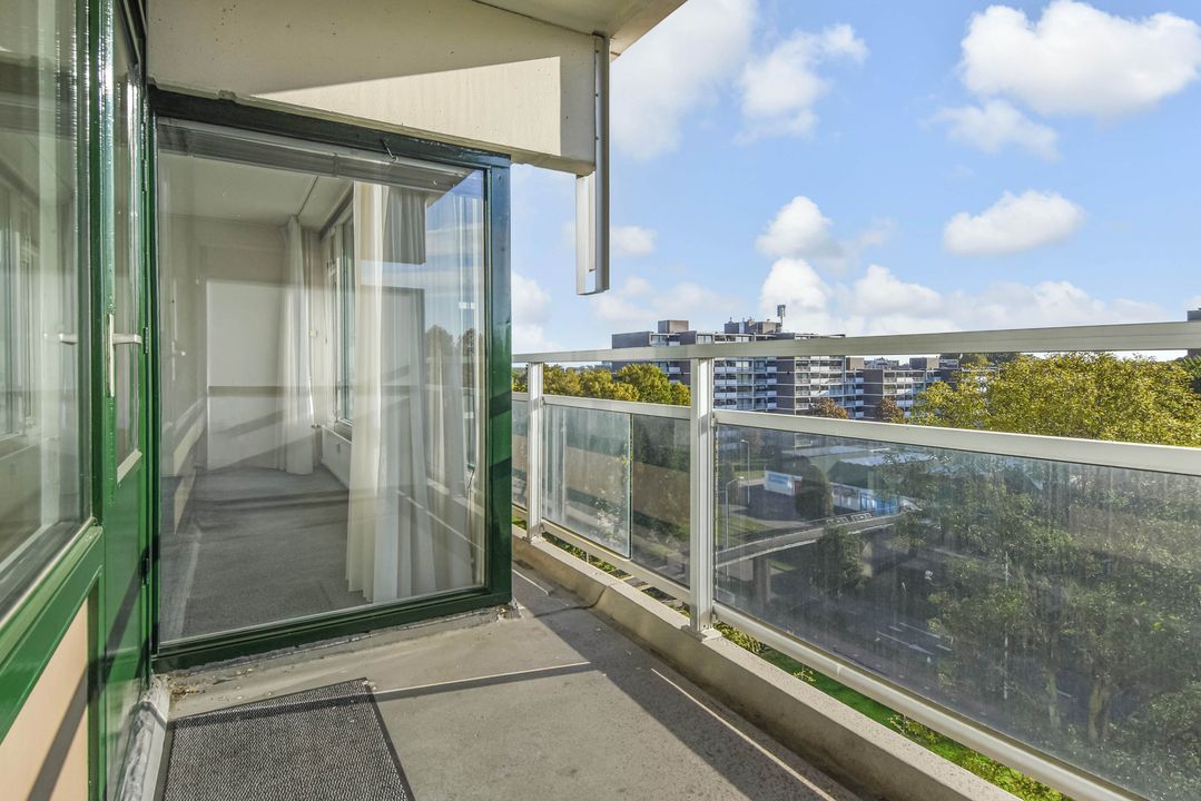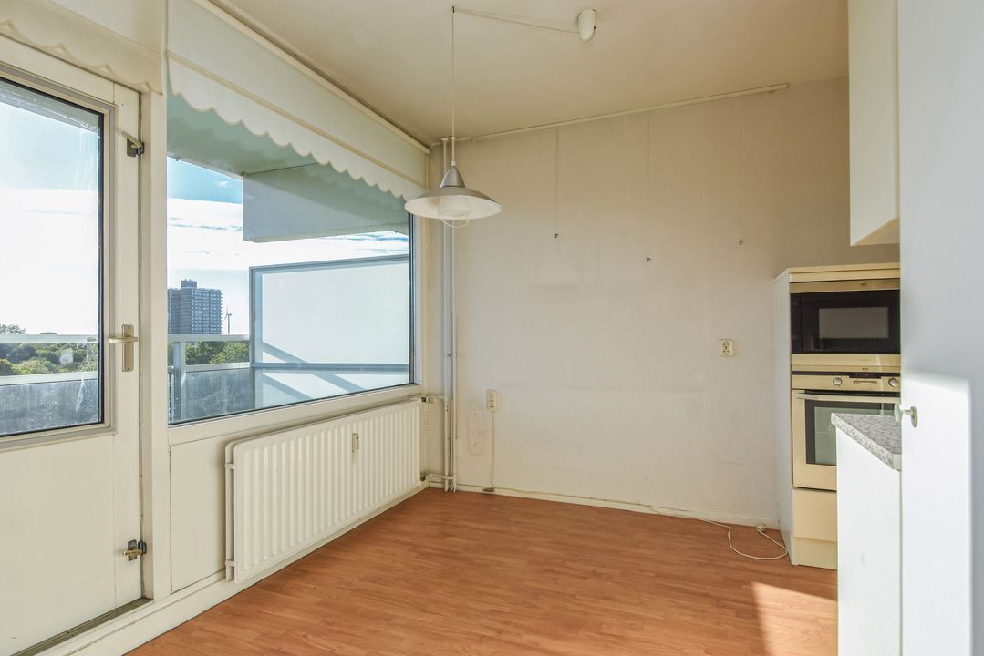 gesloten gemeenschappelijk entree met brievenbussen en video intercom, lift naar de zevende etage. Entree appartement, ruime hal met meterkast. Royale en ontzettend lichte woon-/eetkamer met aan de voorzijde vrij uitzicht over het groen en de Rodelaan en aan de achterzijde een fraai zicht op de Haagse skyline. Aan de voorzijde gelegen semi open keuken met blok aan weerszijden, diepe vaste kast en diverse inbouwapparatuur (koelkast, vriezer, oven, magnetron, vaatwasser, gaskookplaat en afzuigkap). Vanuit de keuken toegang tot her eerste ruime balkon met uitzicht over het groen en de ochtend- en middagzon. Het tweede balkon is vanuit de eetkamer bereikbaar, heeft fraai uitzicht op de skyline en heeft zon in de latere middag/avond. Royale hoofdslaapkamer van 19m2. Tweede goed formaat slaapkamer van ca. 12mw met vaste wastafel. Nette badkamer voorzien van hoekdouche met glazen wand, vaste wastafel in meubel en wasmachine aansluiting. Separaat net toilet met fontein. Het appartement beschikt over een eigen (fietsen)berging op de begane grond.